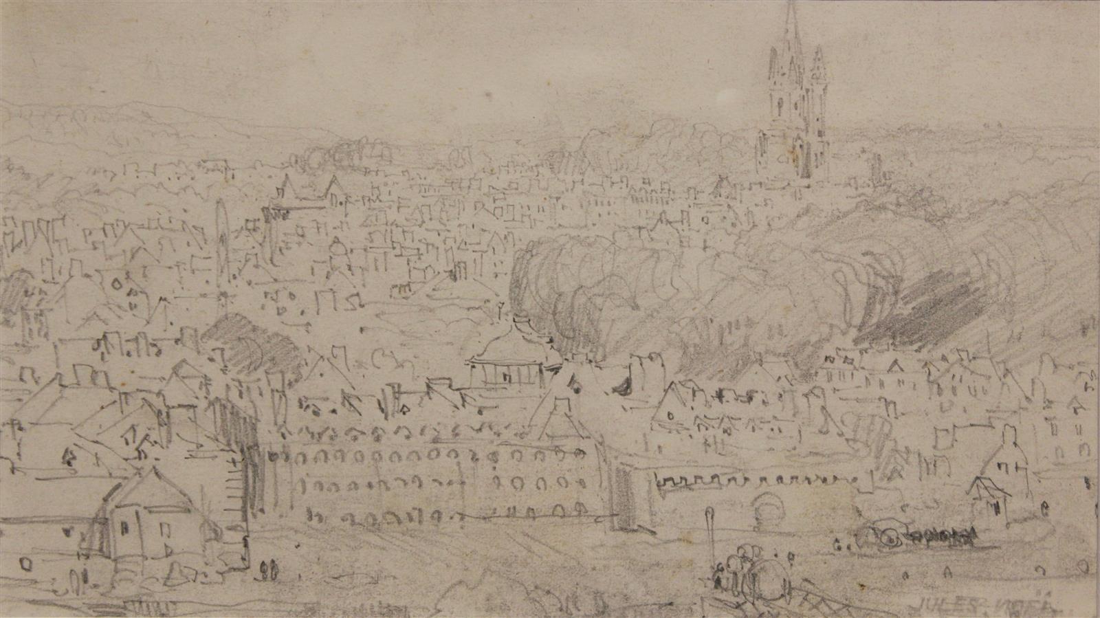 Jules NOËL (1815-1881), "Arrivée des charrettes à Hennebont", dessin au crayon, signé en bas à droite, 11 x 18 cm