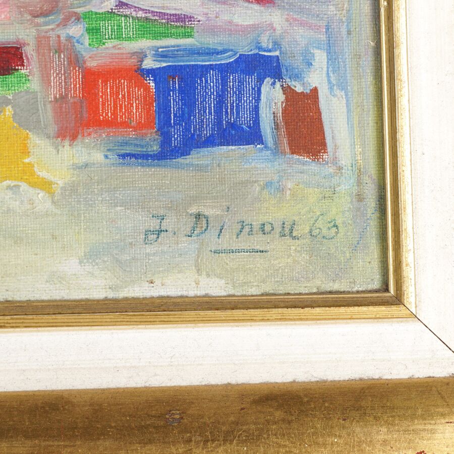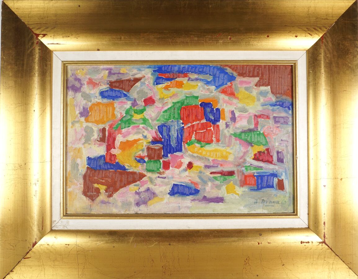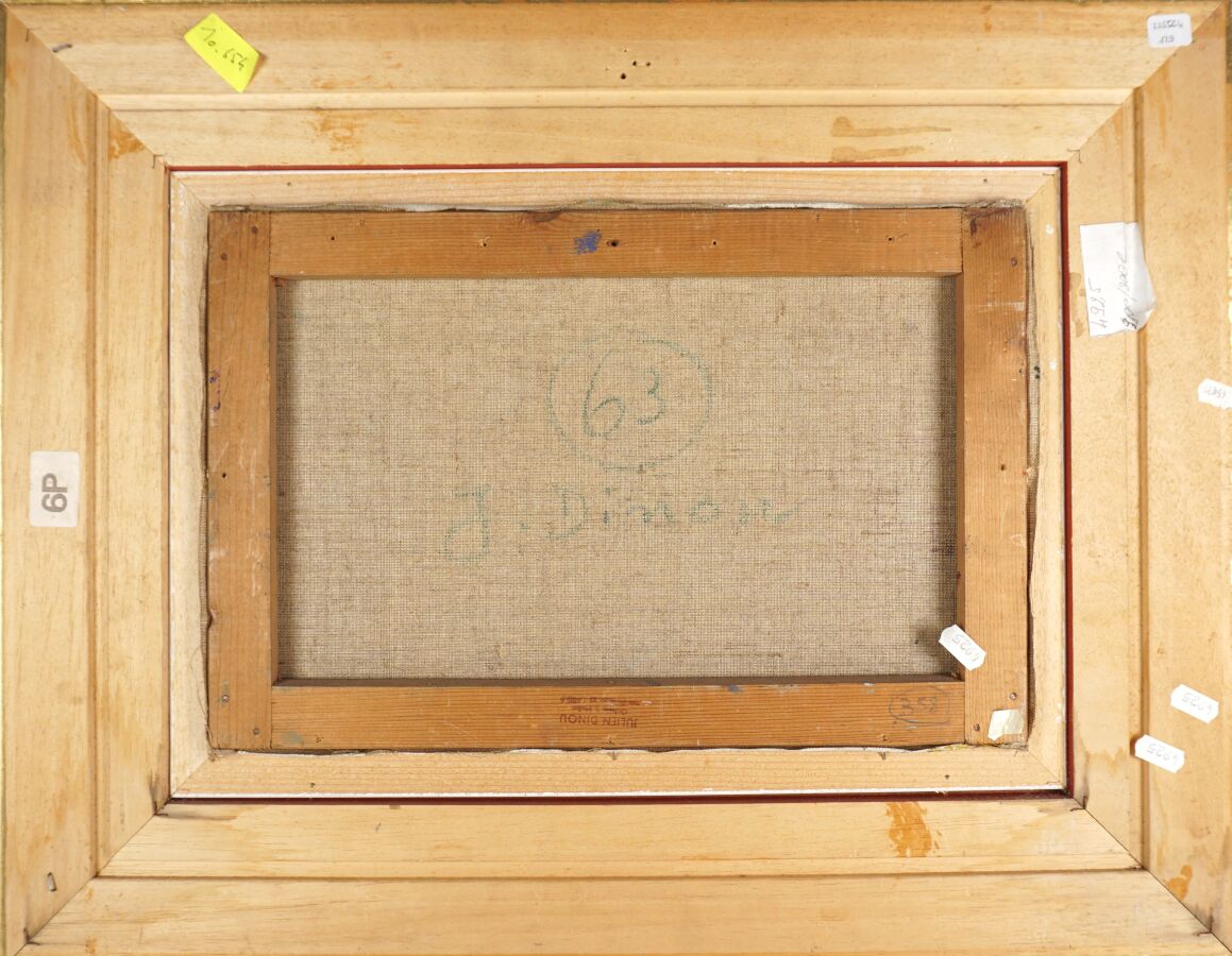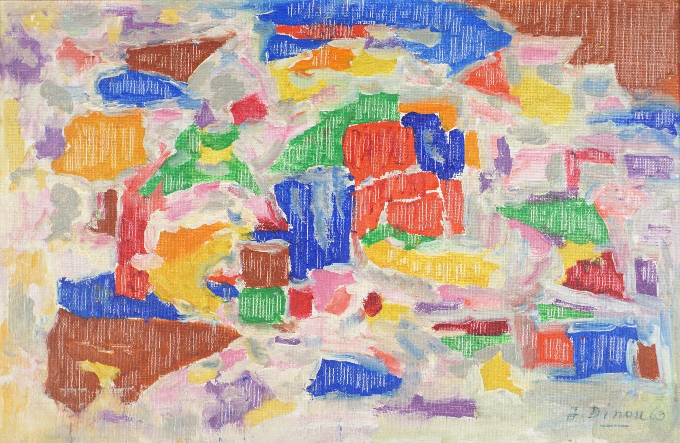Julien DINOU (1895-19836), "Composition" 63, huile sur toile signée et datée en bas à droite, contresignée et datée au dos, porte la cachet de l'artiste au revers, 27 x 40.8 cm.