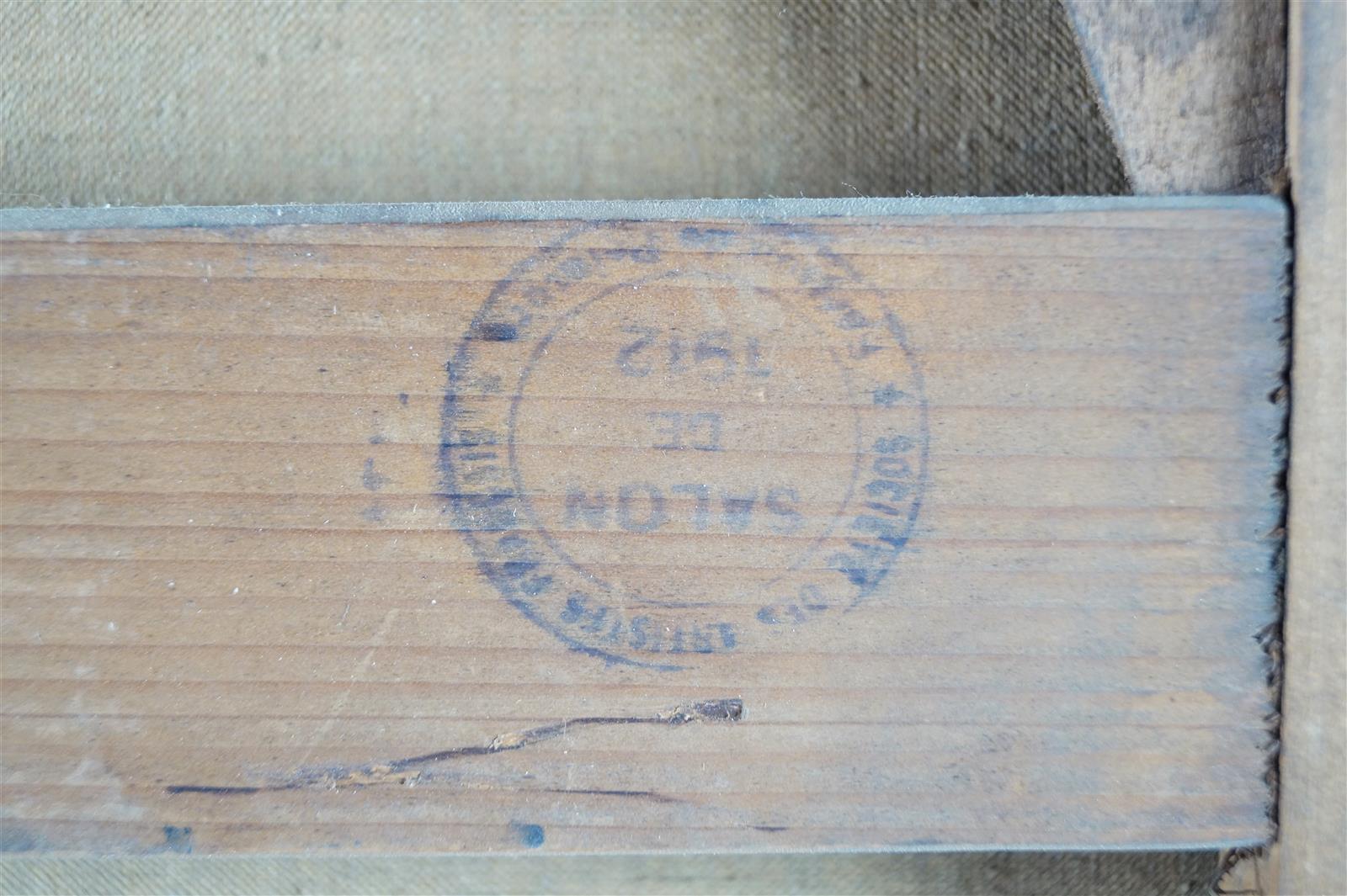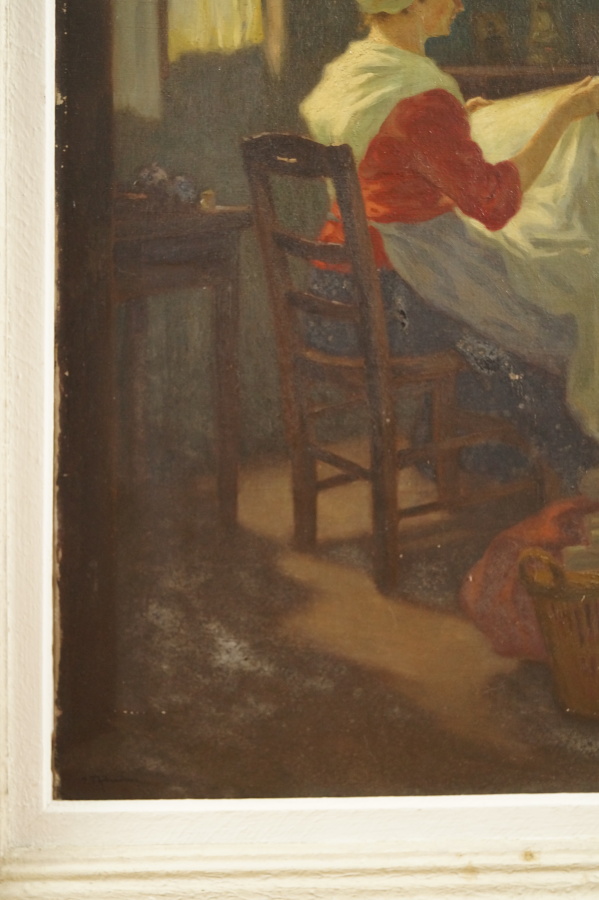 Julien THIBAUDEAU (1859-?), "La lecture" 1912, huile sur toile signée en bas à gauche, contresignée et datée au dos, porte sur le châssis un cachet du Salon 1912 de la Société des Artistes, 80.5 x 65 cm (petits manques et restaurations).