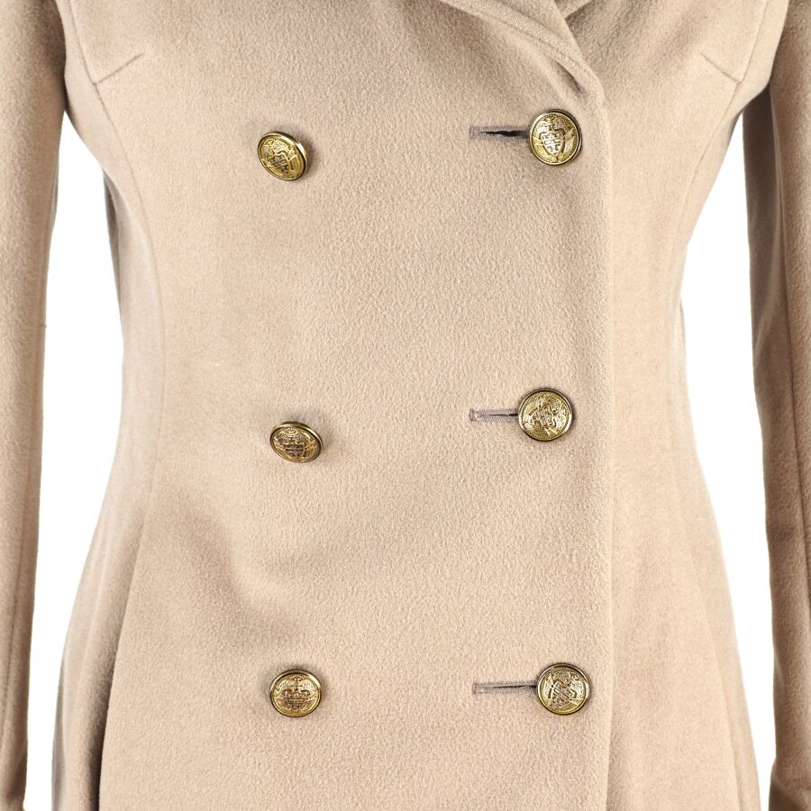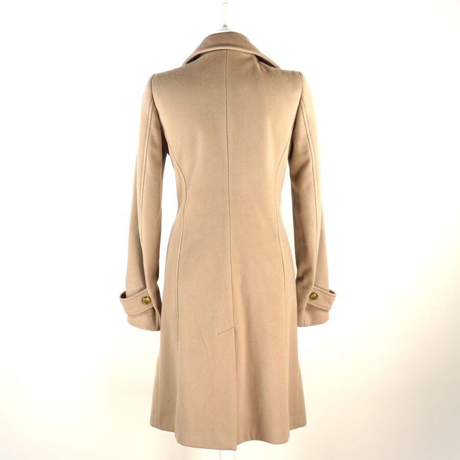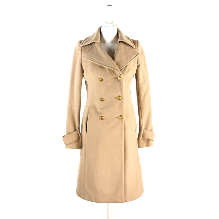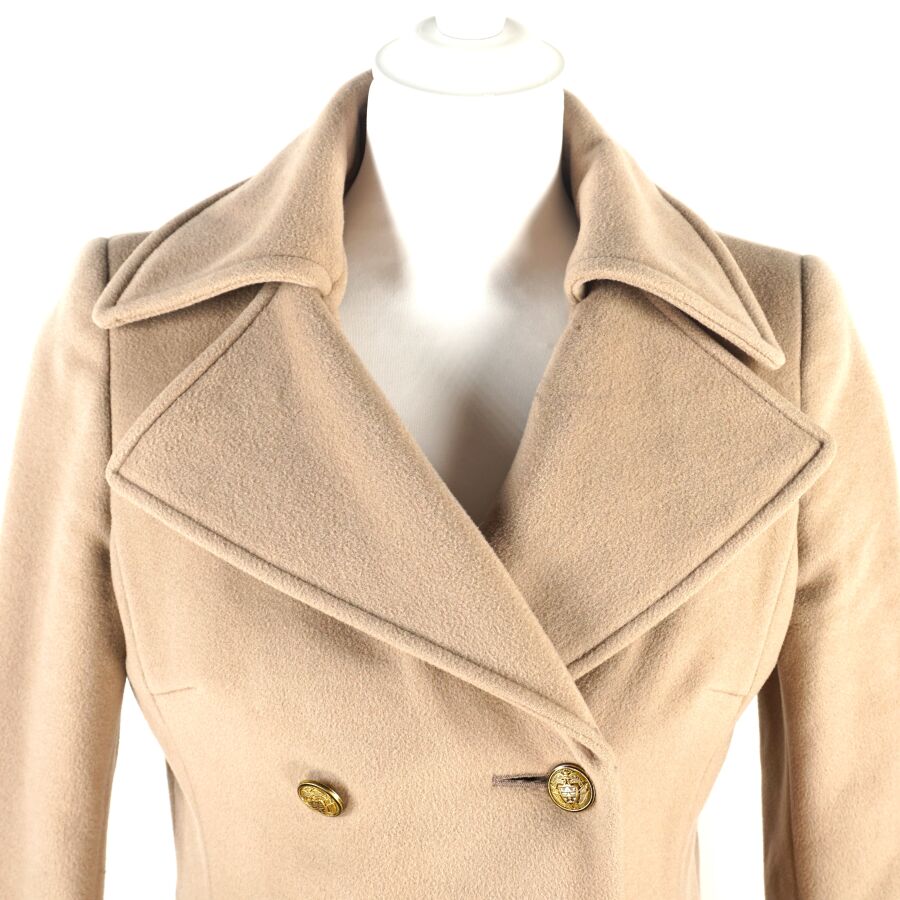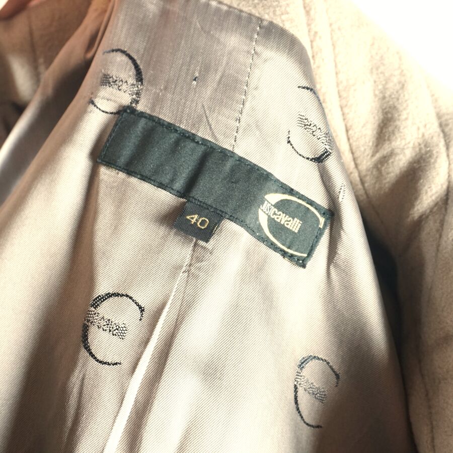 JUST CAVALLI : Manteau en laine et cachemire marron - beige, col dit tailleur, fermeture à l'avant par trois boutons en métal doré, manches longues avec boutons aux extrémités, deux poches basses latérales, doublure logotée, taille indiquée 40, L. Totale : 100 cm (quelques traces, petits accrocs).