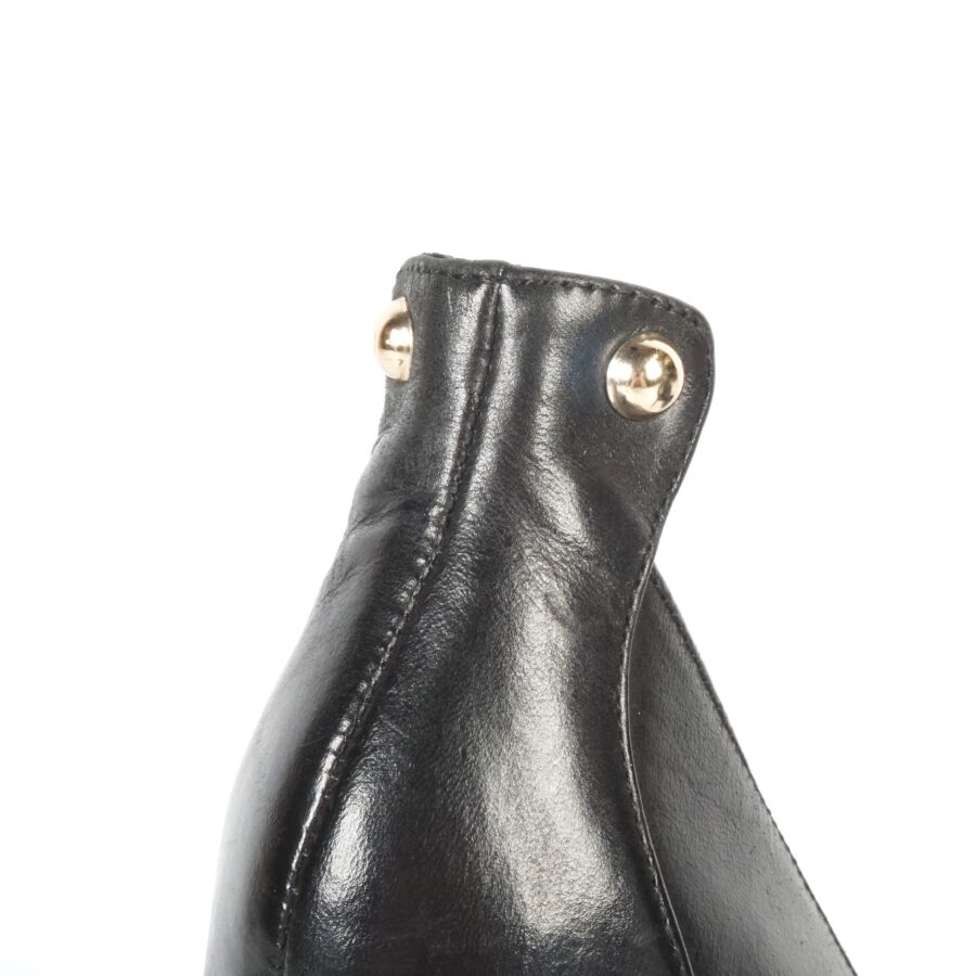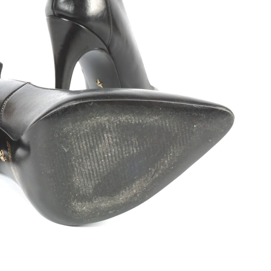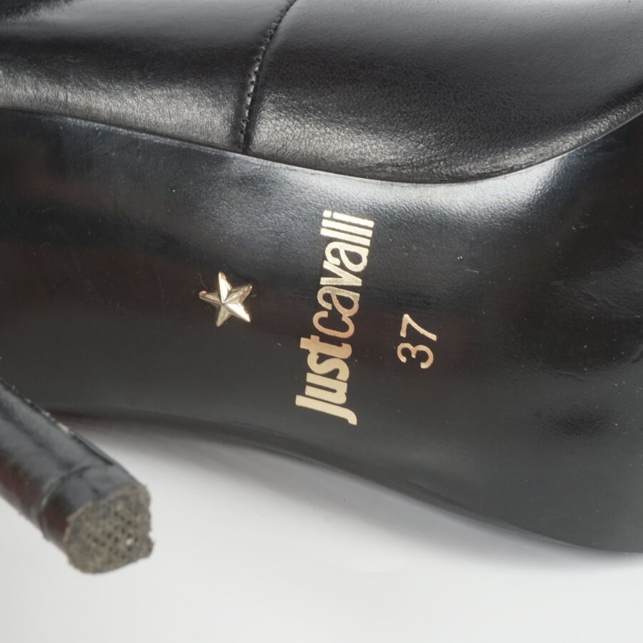 JUST CAVALLI : Paire d'escarpins en cuir lisse noir, bouts pointus, montants ornés de deux demi-sphères en métal doré, taille 37, H. Talon : 11 cm (quelques petites usures d'usage).