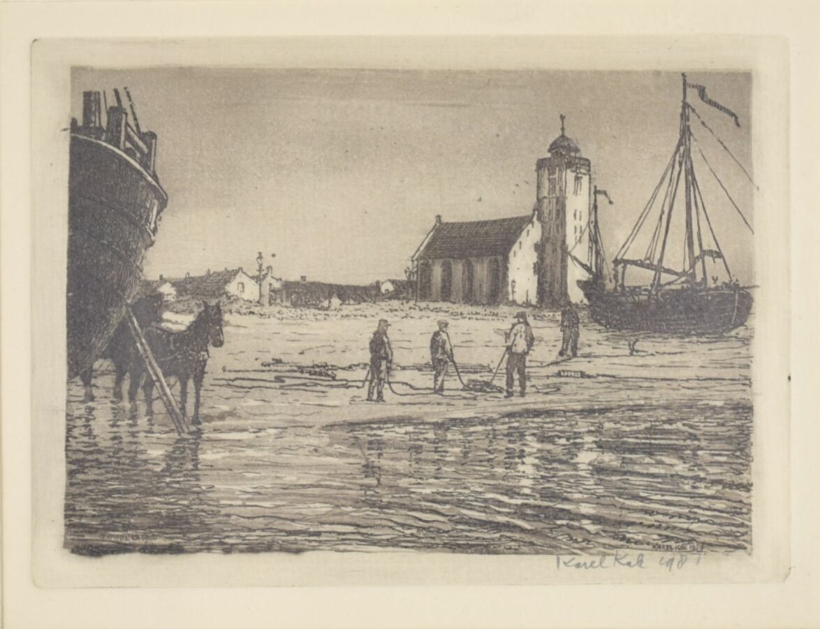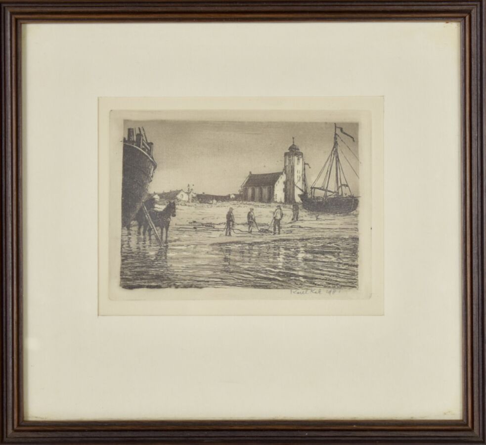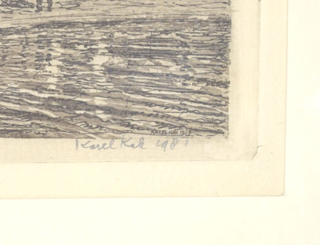 Karel KALE (XXe), "Pêcheurs au bord de la rive", gravure à l'eau-forte et l'aquatinte, signée en bas à droite dans la marge, 8 x 11 cm.