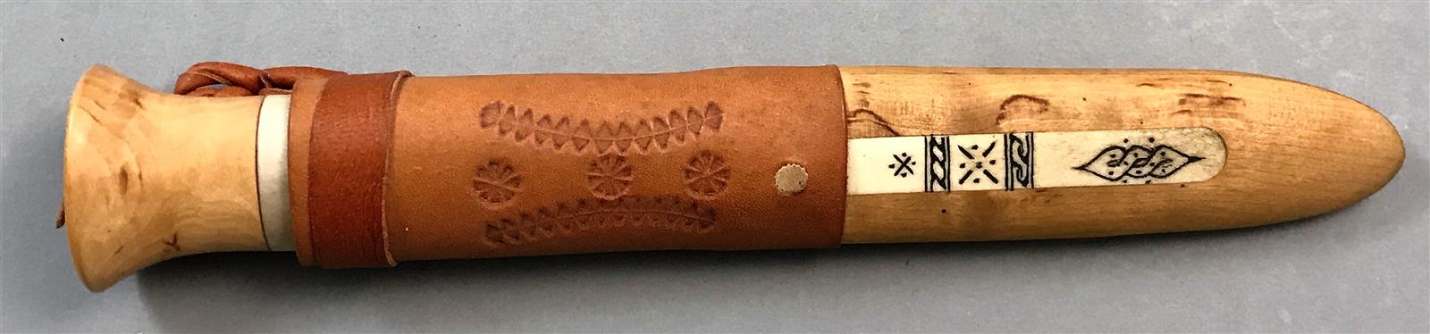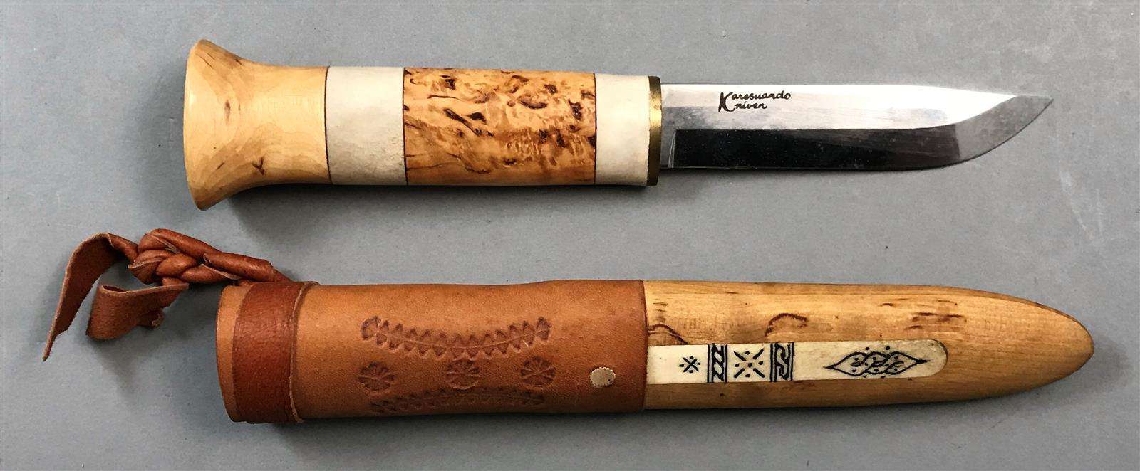 KARESUANDO - COUTE AU DE CHASSE, poignée en bois et corne, lame de 10 cm, fourreau en cuir, bois et corne, TBE.