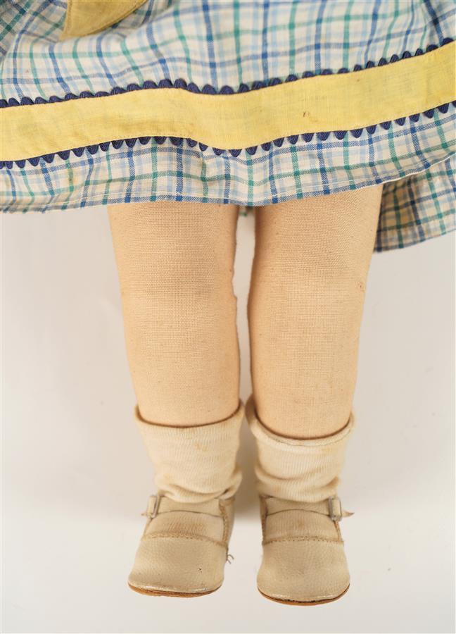 KÄTHE KRUSE : Poupée allemande, corps tissu et tête en matière pressée, habits et perruque, H. 50 cm (usures d'usage).