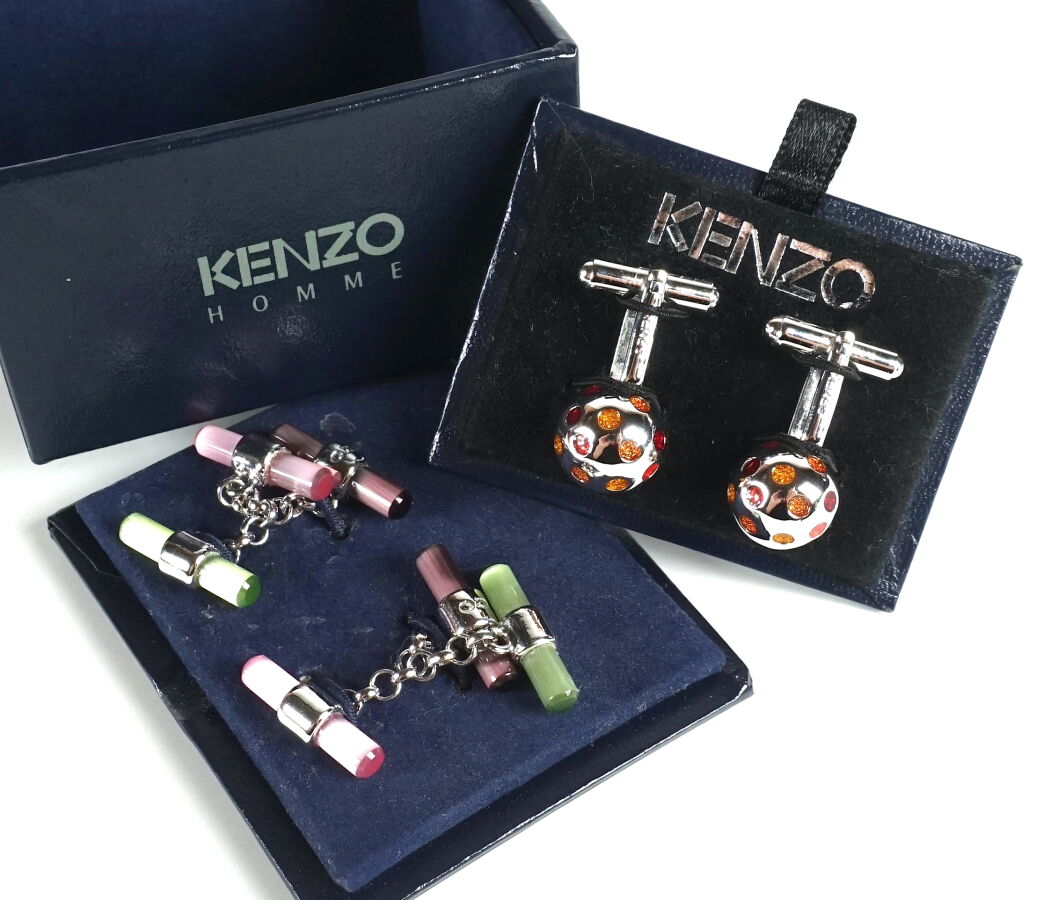 KENZO : Ensemble de 2 paires de boutons de manchette en métal, un modèle rond agrémenté de pois rouges et orange, l'autre formé de 3 bâtonnets mobiles, dans les tons verts et parme.