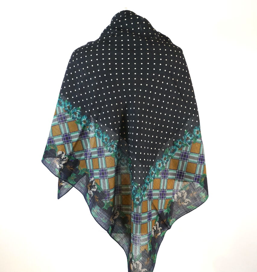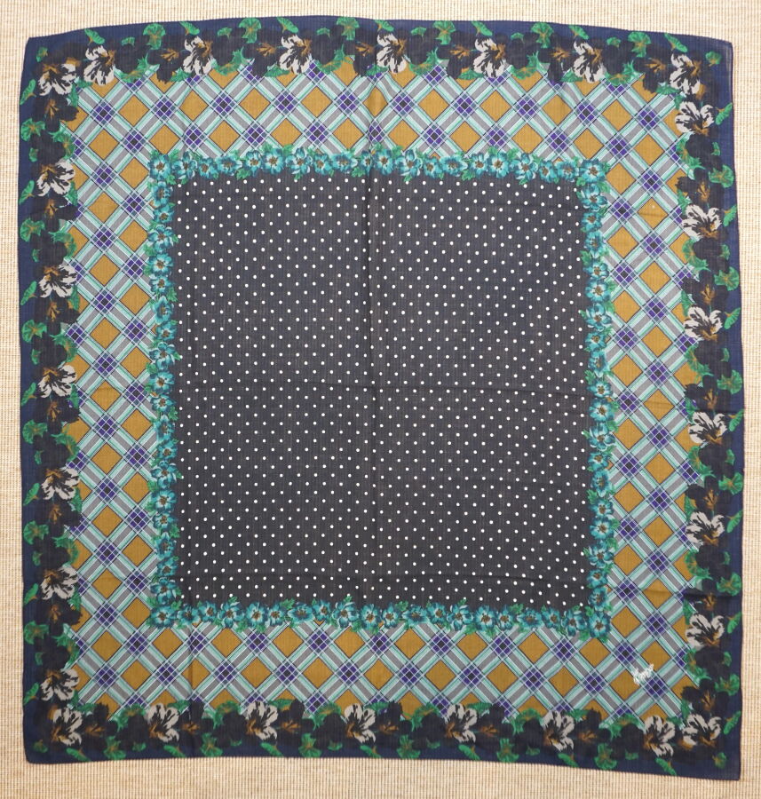KENZO : Etole à décor de fleurs, croisillons et pois, dans les tons vert, brun, mauve, noir et blanc, marge bleu marine, signée, 110 x 110 cm environ.
