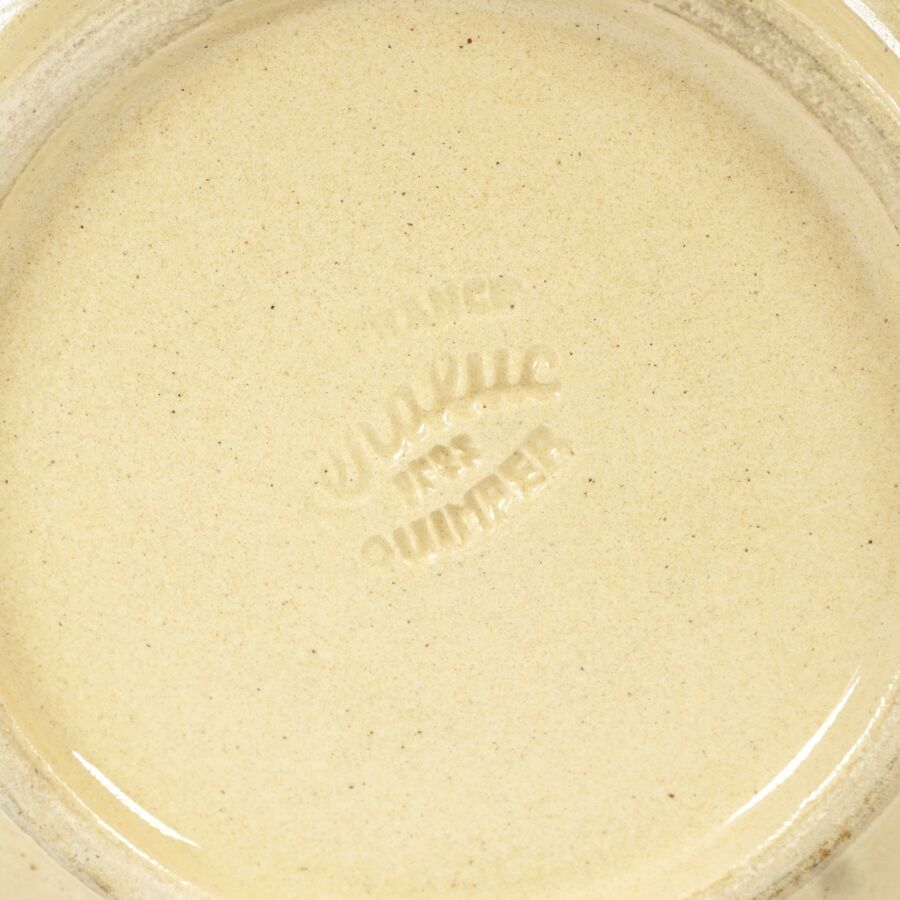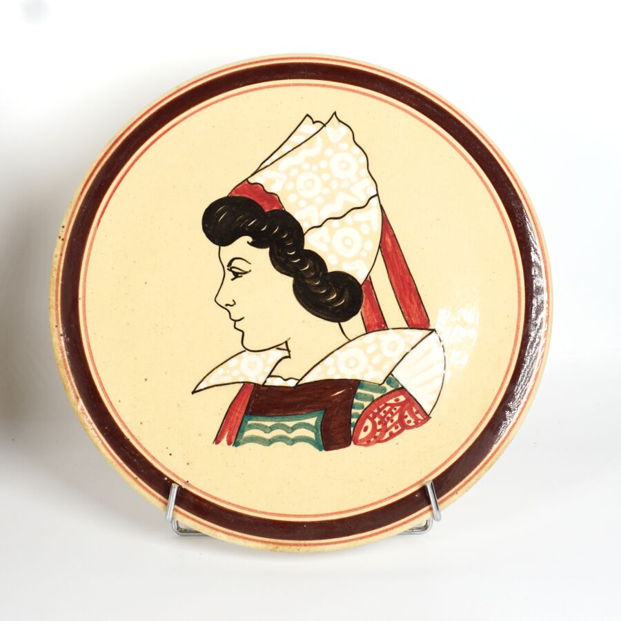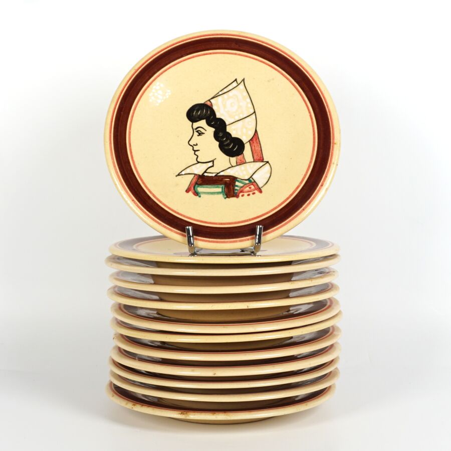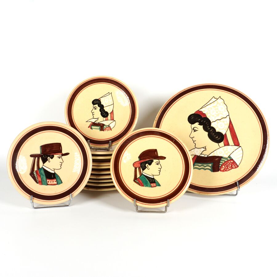KERALUC - QUIMPER : Service à dessert en faïence émaillée polychrome à décor de portraits de bretons et bretonnes comprenant 12 assiettes à dessert et un plat à gâteau, marqués dessous, circa 1950, D. Assiette : 17 cm. D. Plat : 27 cm.