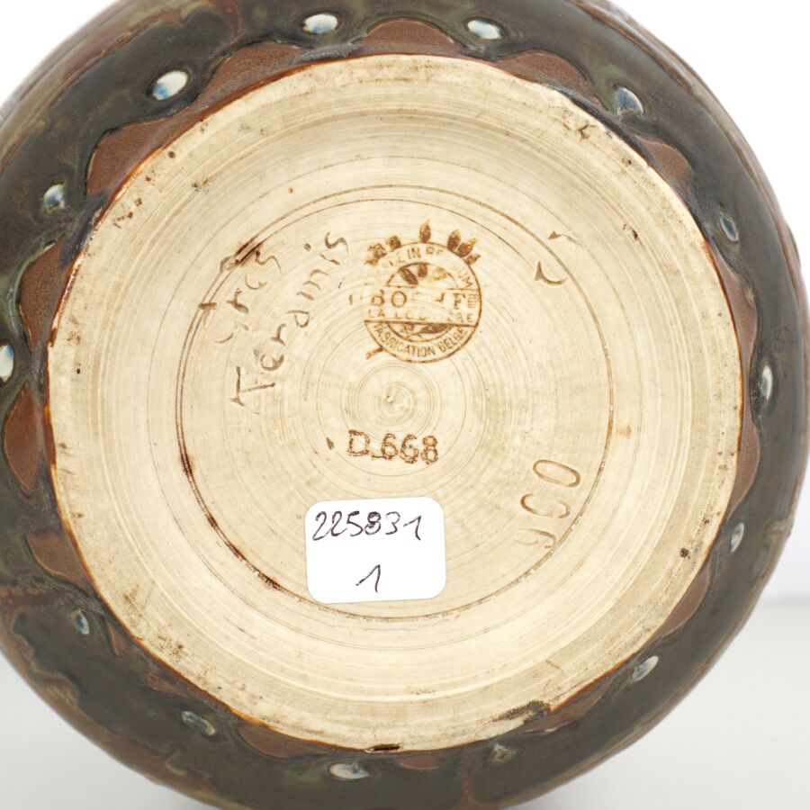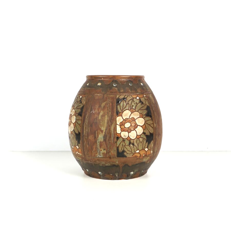 KERAMIS BOCH : Vase boule en grès émaillé polychrome à décor en réserve de fleurs stylisées, marqué sous la base et numéroté "D668", H. 17 cm (à nettoyer).