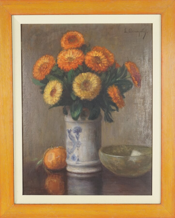 L. DENOYELLE (XXe), "Nature-morte au vase de soucis", huile sur carton signée en haut à droite, 34 x 26 cm.