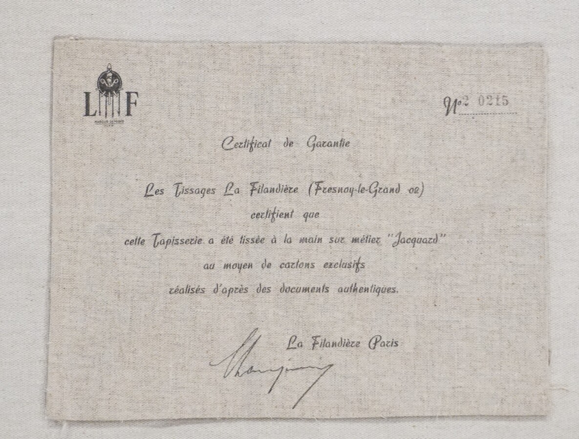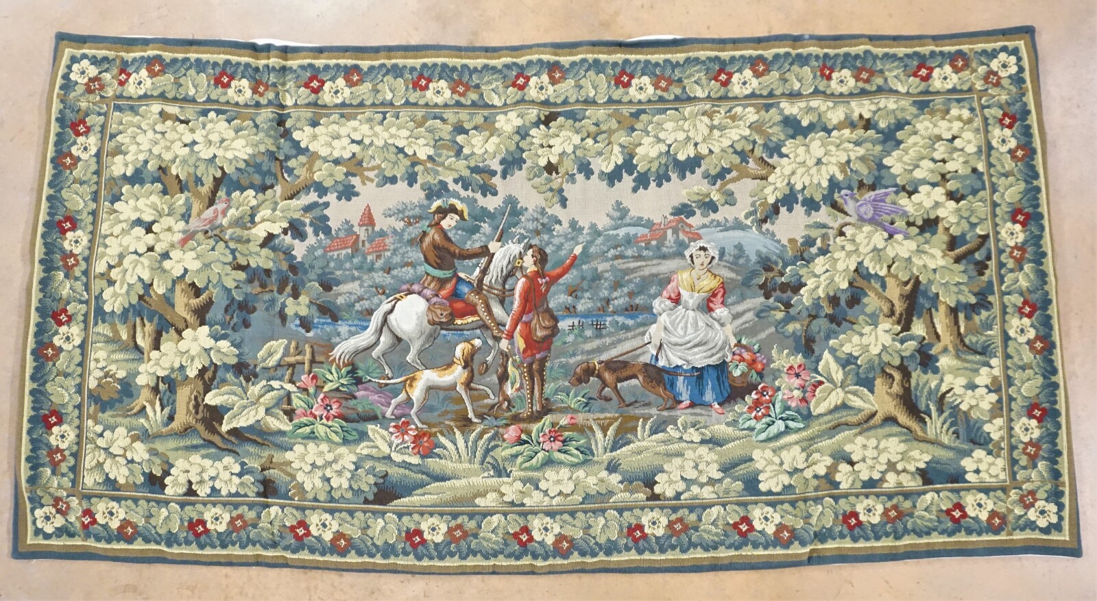 La Filandière Paris; tapisserie en laine représentant une scène de retour de chasse, 101 x 193 cm (porte une étiquette au dos)
