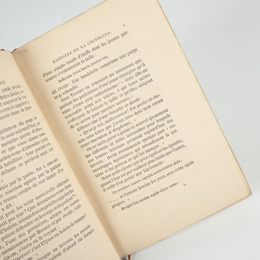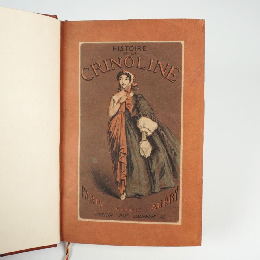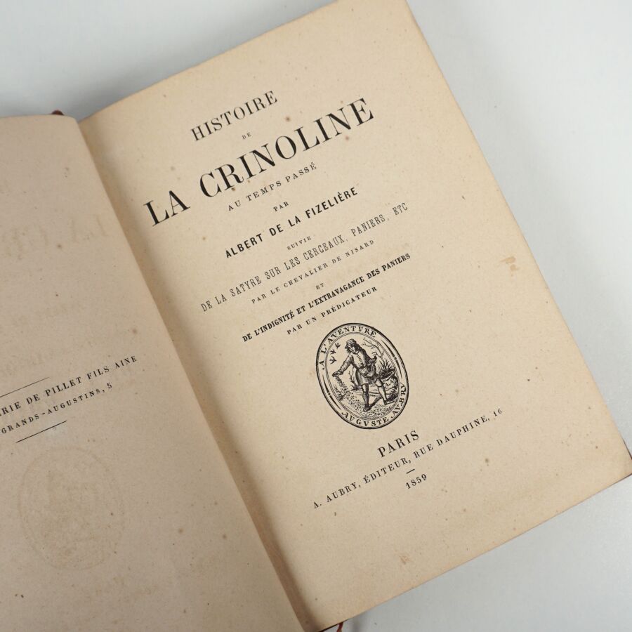 LA FIZELIÈRE (Albert de). Histoire de la crinoline au temps passé, suivie de la Satyre sur les cerceaux, paniers, etc. par le chevalier de Nisard et de l'Indignité et l'Extravagance des paniers par un prédicateur. Paris, Aubry, 1859. In-12 bradel demi-toile brique à coins, pièce de titre havane, non rogné, couverture illustrée et dos conservés (Stroobants).