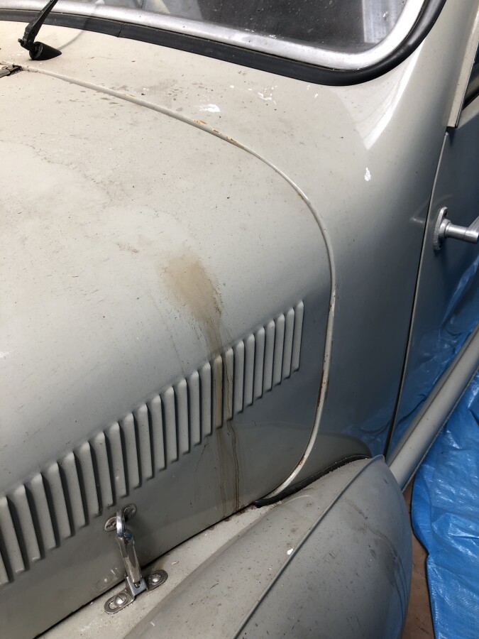 La carrosserie de la Licorne est en bon état. De petites traces et des coulures sur la carrosserie. Des usures au niveau de la peinture du feu avant gauche sont à noter. Dans l'ensemble la voiture présente un bel état extérieur.