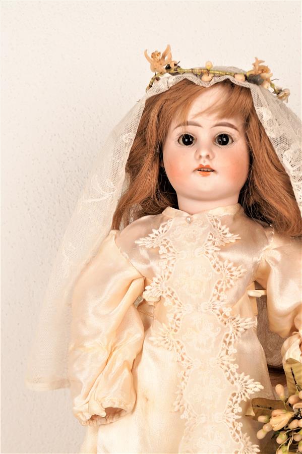 "La Mariée", tête porcelaine attribuée à FLEISCHMANN, taille 3, yeux marron dormeurs, corps articulé, habits et perruque, H. 45 cm.