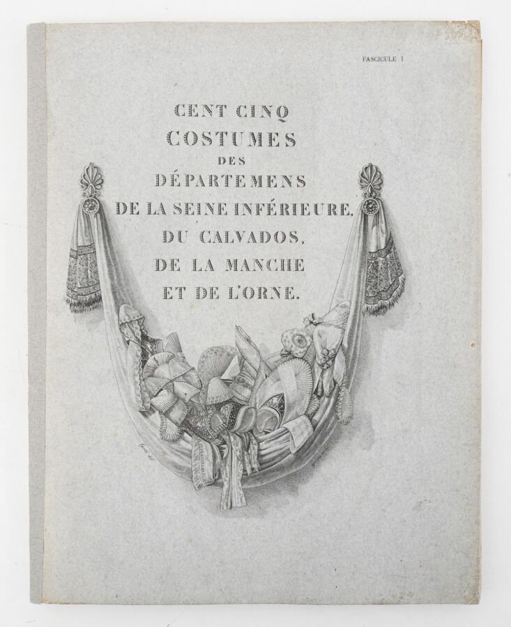 LA MÉSANGÈRE (Pierre de) & LANTÉ (Louis-Marie). Costumes des femmes du Pays de Caux. Paris, Le Goupy, 1925-1926. 3 fascicules in-folio (325 x 253 mm), 2 ff. n. ch., 44 pp., 1 f. n. ch., en feuilles, couvertures grises portant l'épreuve du frontispice en noir, quelques rares rousseurs, dos des chemises restaurés, étui moderne avec reproduction du frontispice sur un plat et étiquette de titre au dos.