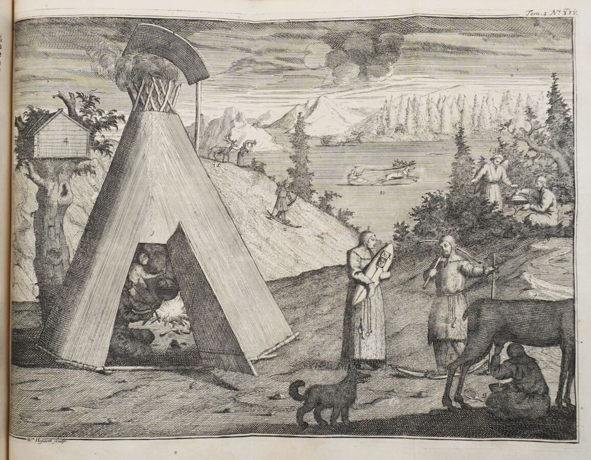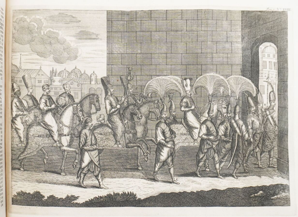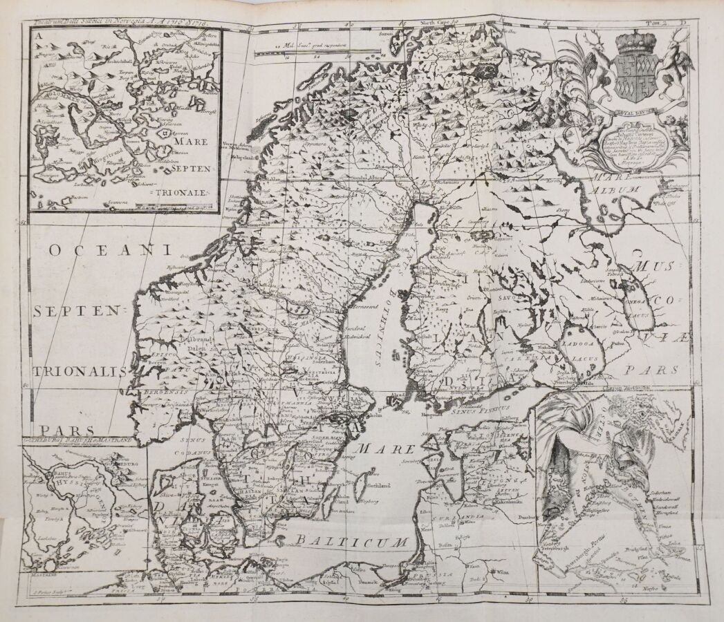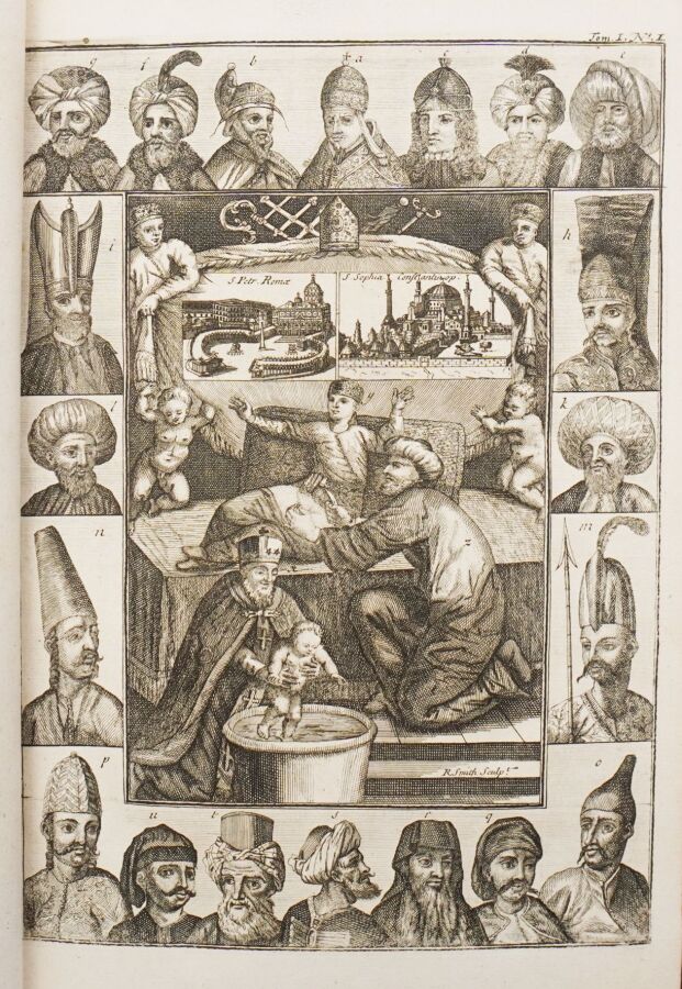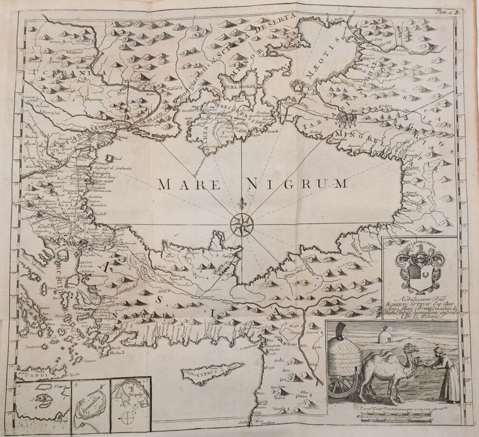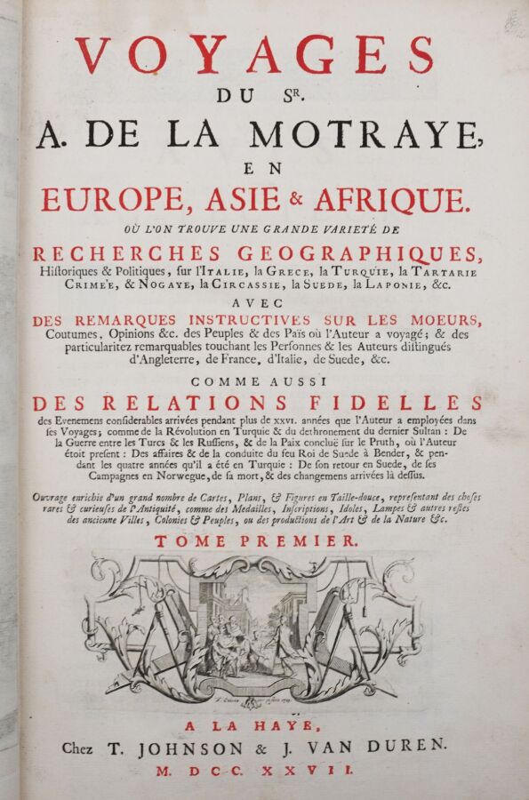 LA MOTRAYE (Aubry de). Voyages en Europe, Asie & Afrique. Où l'on trouve une grande variété de recherches géographiques, historiques et politiques, sur l'Italie, la Grèce, la Turquie, la Tartarie crimée, & Nogaye, la Circassie, la Suède, la Laponie, &c. Avec des remarques instructives sur les moeurs, coutumes, opinions &c. des peuples & des païs où l'auteur a voyagé [...] La Haye, Johnson & J. Van Duren, 1727. 2 vol. in-folio de I. [7] ff., 472-23 pp., front., 29 pl. dont VII bis, 2 cartes A et B. - II. (3) ff., 496-39 pp., 18 pl. dont IX bis et 2 cartes C et D (sans le frontispice du tome I répété). Demi-veau brun à coins, dos à nerfs ornés, pièces de titre et de tomaison en basane beige et verte (reliure début XIXe siècle).
