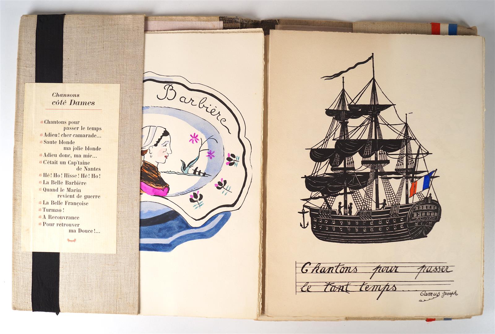 LA PIPE (Jean), quartier-maître à bord de la Pétulante [ROY (Bernard)] - Cahier de chansons - Sans lieu ; sans nom, sans date [vers 1930] - 1 volume grand In-4° en feuillets sous chemise de toile grège à rabats et lacets - Pièce de titre papier contre collée au 1er plat, ainsi que ruban titré La Pétulante collé en long au 1er plat, ruban au couleurs du drapeau français collé au 2nd plat - 20 doubles feuillets répartis de chaque côté de la chemise, 12 chansons pour les femmes, 8 chansons pour les femmes - Musique gravée, compositions, certaines à pleine page, illustrant chaque chanson, toutes rehaussées au pochoir - Édition originale de cet amusant recueil de chansons maritimes paillardes, publié et illustré par Bernard Roy sous les pseudonymes de Jean La Pipe - Très bon exemplaire numéroté (24 sur 250) enrichi d'1 envoi autographe signé de Jean La Pipe et d'1 double page de composition originale à l'encre noire (Hymne à l'artillerie de Marine) de la main de Bernard Roy.