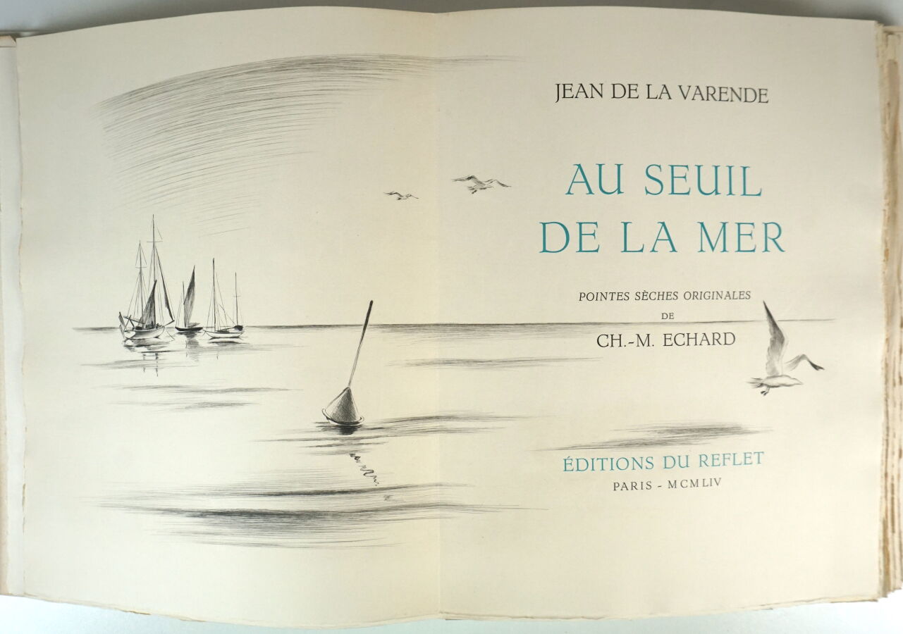 LA VARENDE (Jean de) - Au seuil de la mer - Paris ; Éditions du Reflet, 1954, impression par Dominique Viglino - 1 volume In-4° en feuilles sous couverture rempliée (brunie), chemise titrée or au dos et emboîtage - 23 pointes-sèches originales de Charles-Marie Échard in et hors texte, certaines sur double page - Très bon exemplaire en édition originale numérotée sur Rives B.F.K. avec signature autographe de l'artiste (n°27 sur les 40, tirage total : 201 + 20 hors commerce) et avec suite en 2e état avec remarques sur Annam de Rives.