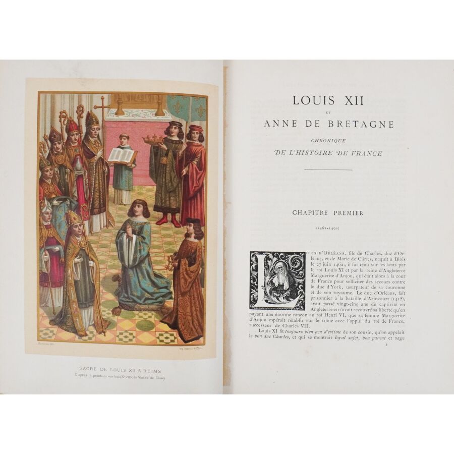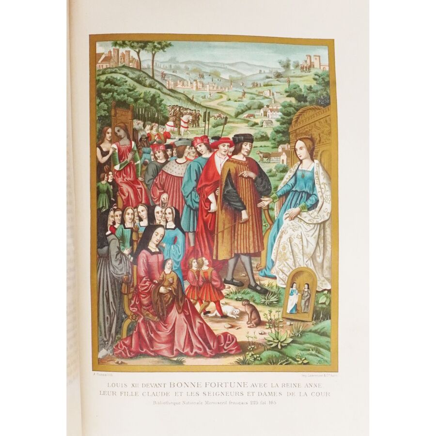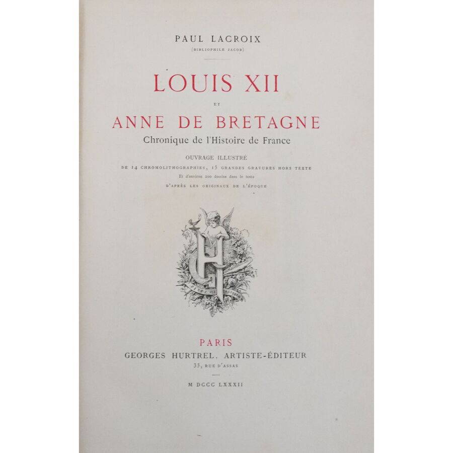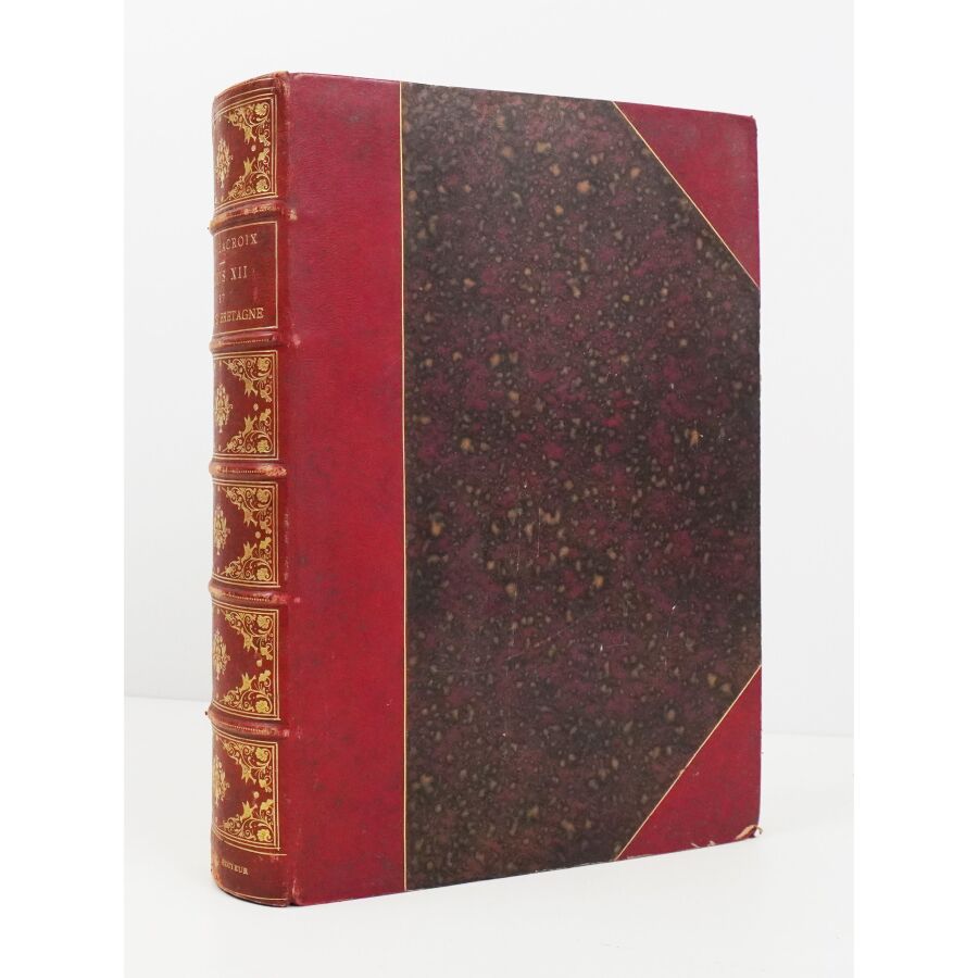 LACROIX (Paul). Louis XII et Anne de Bretagne. Chronique de l'histoire de France. Ouvrage illustré de 14 chromolithographies, 15 grandes gravures hors texte et d'environ 200 dessins dans le texte d'après les originaux de l'époque. Paris, Hurtrel, 1882. Fort in-4 demi-chagrin rouge à coins, dos à nerfs richement orné, filet doré, tr. dorés (reliure de l'éditeur par Garidel). Coiffes et coins frottés. Qqs rousseurs sur les gardes. Bon ex.