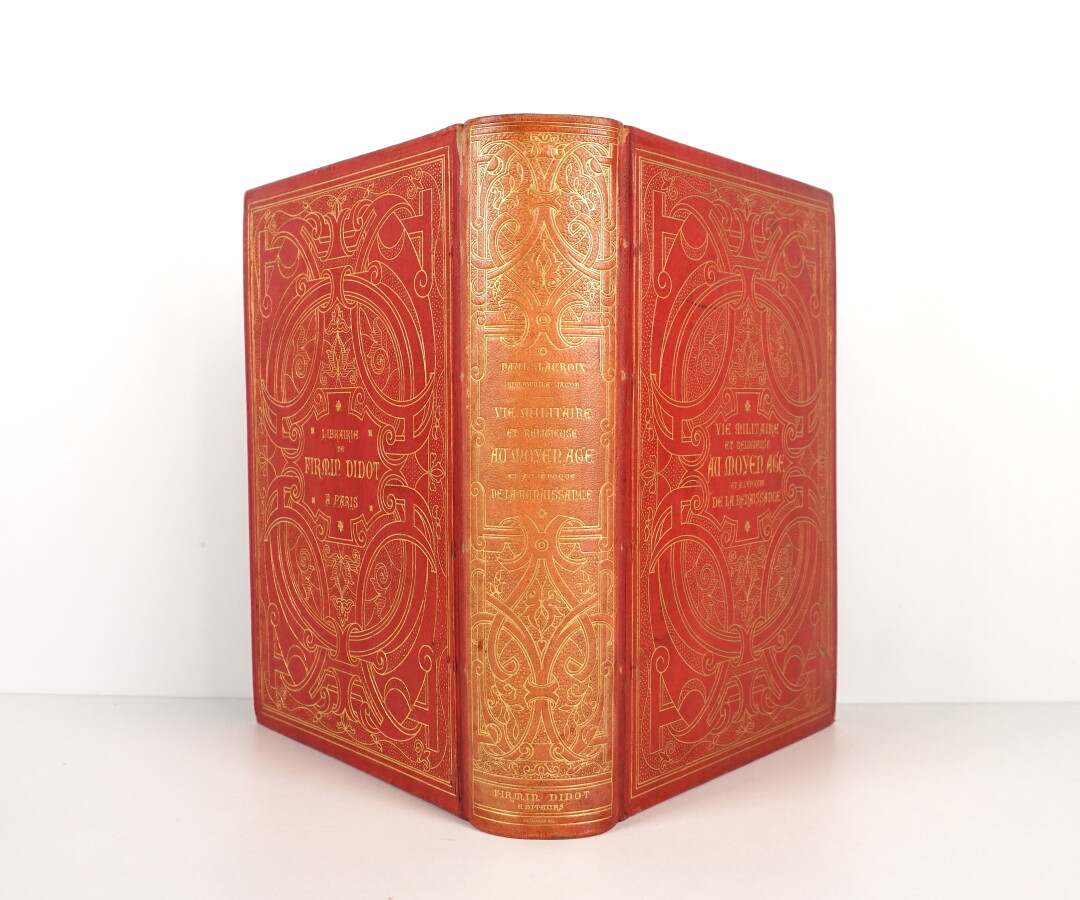 LACROIX (Paul) - Vie militaire et religieuse au Moyen-âge et à l'époque de la Renaissance - Paris ; Librairie de Firmin Didot, 1873 - 1 volume In-4° - Quelques rousseurs éparses - 14 chromolithographies et 410 figures sur bois in et hors texte - Reliure éditeur demi-chagrin bordeaux, plats ornés d'entrelacs et titré or (1ère charnière en partie fendue, 1 éraflure au 1er plat) - Dos lisse orné et titré à l'identique (passé uniformément) - Tranches dorées.