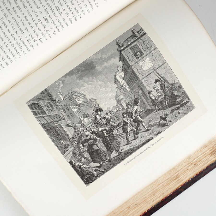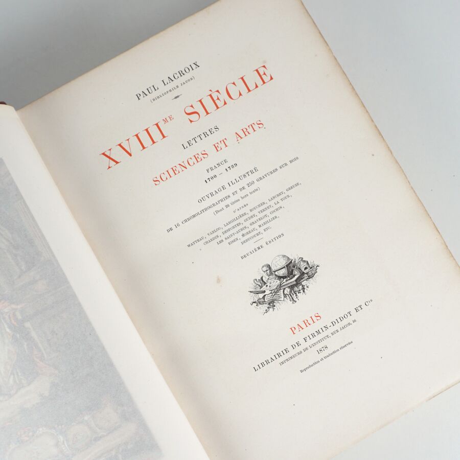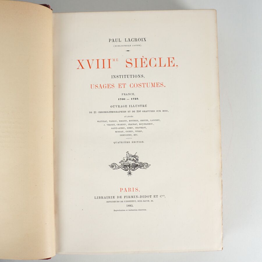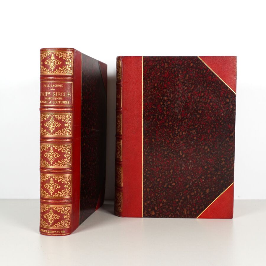 LACROIX (Paul). XVIIIe siècle - Institutions, usages et costumes. France - 1700-1789. Ouvrage illustré de 21 chromolithographies et de 350 gravures sur bois [...] Paris, Firmin-Didot, 1885. In-4, demi-chagrin rouge à coins, dos à nerfs richement orné, titre doré, filet doré, tête dorée (reliure de l'éditeur).