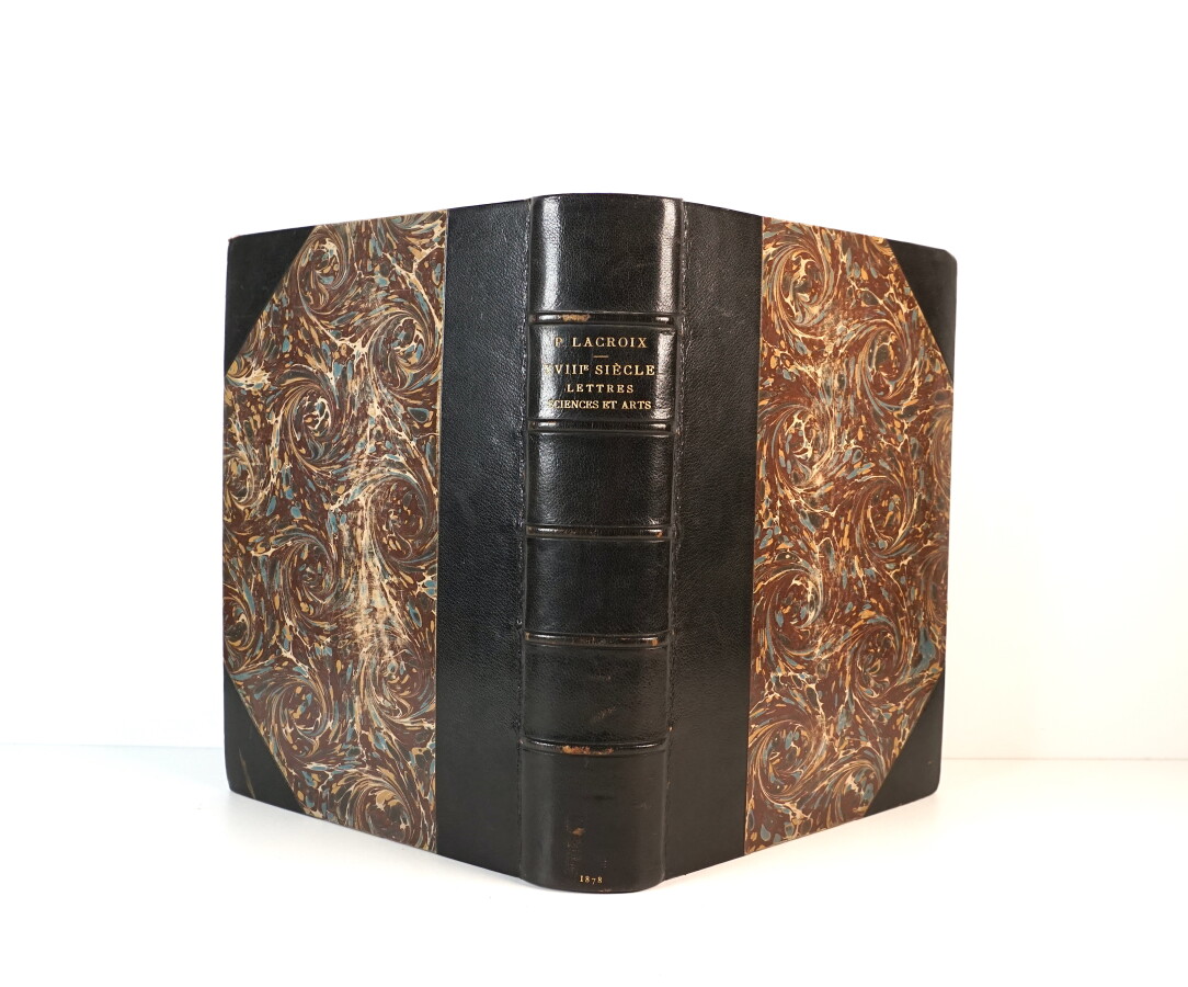 LACROIX (Paul) - XVIIIème siècle. Lettres, sciences et arts. France 1700-1789 - Paris ; Firmin-Didot Frères, Fils et Cie, 1878 - 1 fort volume In-4° - De rares et pâles rousseurs éparses - 16 chromolithographies hors texte dont frontispice et 250 gravures sur bois dont 20 hors texte montées sur chine - Reliure de l'époque demi-chagrin repoussé noir à coins (coins émoussés) - Couvertures et dos conservés - Dos à nerfs titré et daté or - Tête mouchetée de brun - Ex-libris gravé armorié au 1er contre plat : Santi Mattei - Bon exemplaire numéroté (n°469) sur les 650 sur grand papier.