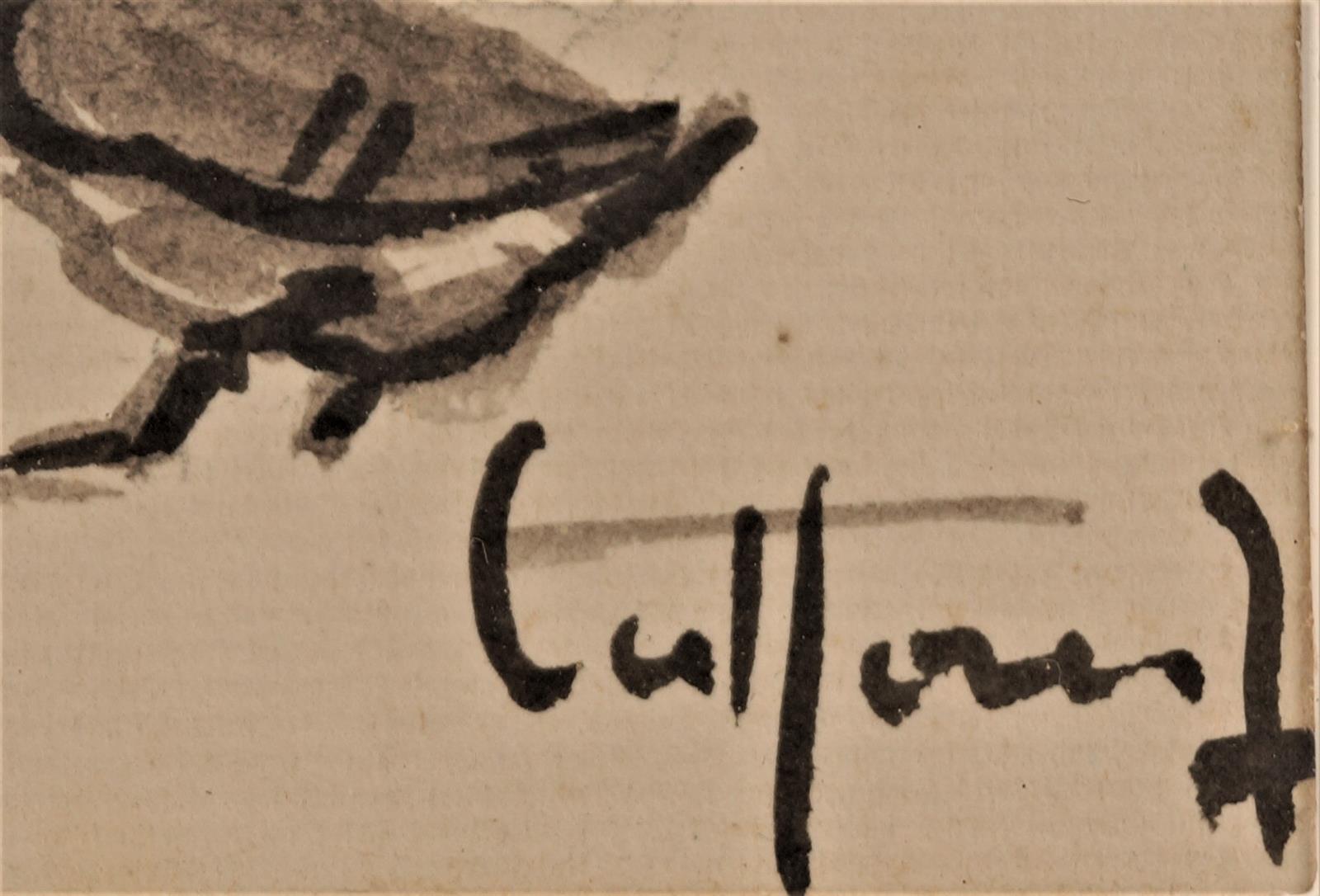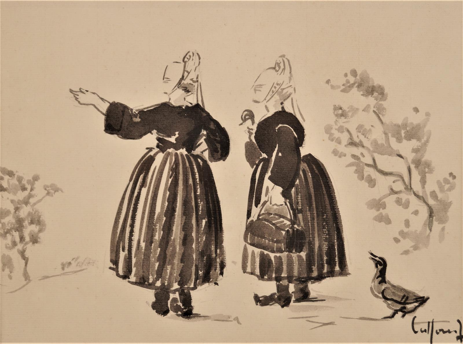 LAFFON (?), "Bretonne en conversation et son oie", lavis, signé en bas à droite, 18 x 23 cm.