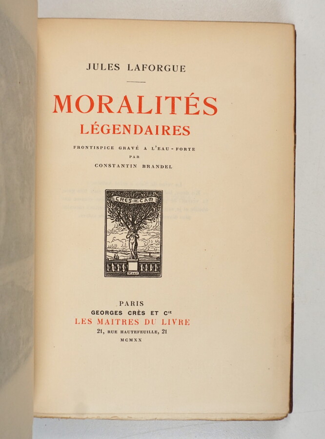LAFORGUE (Jules) - Moralités légendaires - Paris ; Georges Crès et Cie, 1920 - 1 volume grand In-12° - Frontispice gravé à l'eau-forte par Constantin Brandel - Reliure de l'époque demi-veau havane à coins signée Flammarion-Vaillant (mors légèrement frottés) - Couvertures conservées - Dos lisse mosaïqué, titré et orné or (assombri) - Tête dorée - Bon exemplaire numéroté sur vélin.