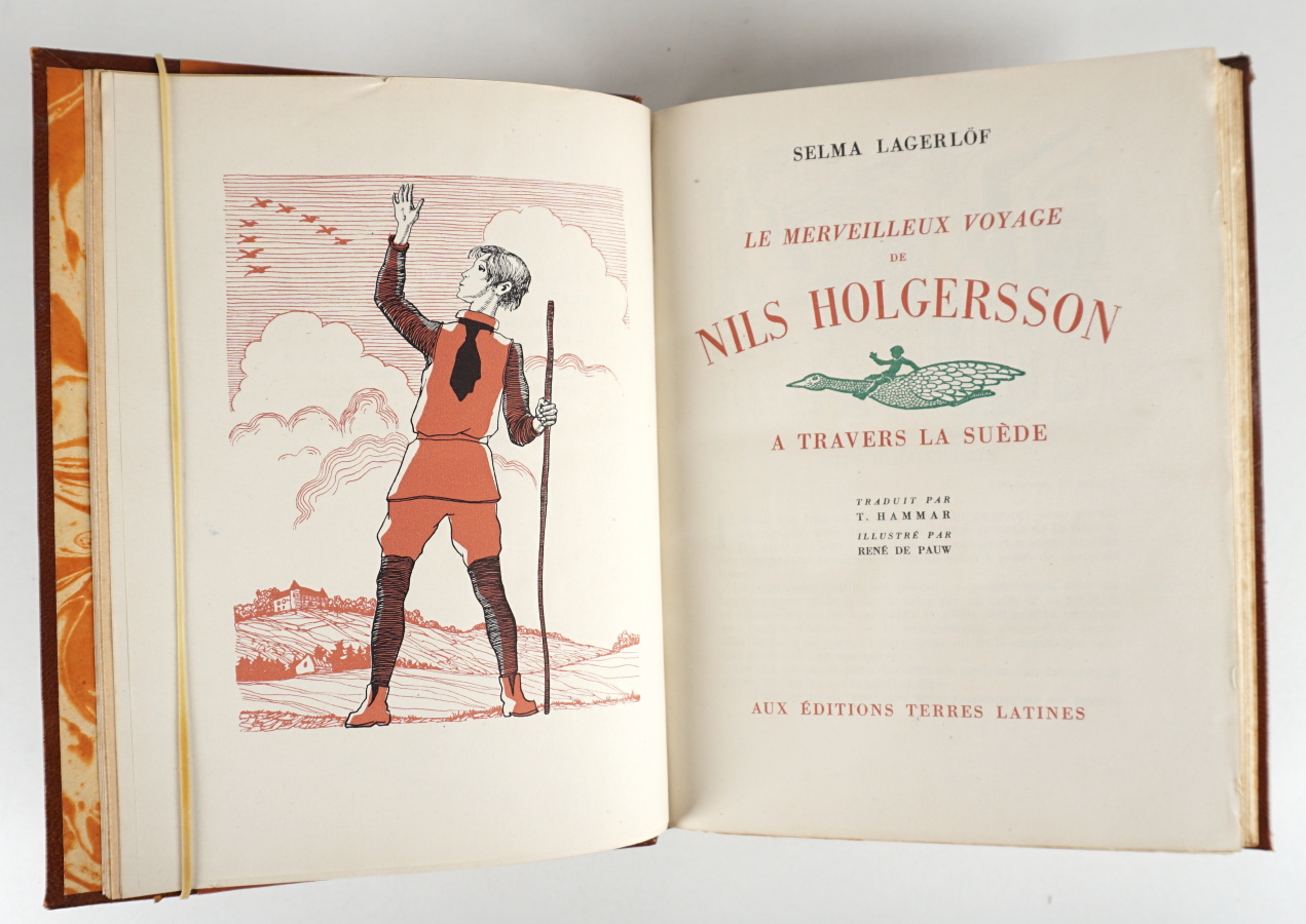LAGERLÖF (Selma) - Le merveilleux voyage de Nils Holgersson à travers la Suède - Paris ; Aux Éditions Terres Latines, 1945 - 1 volume In-8° - Illustrations couleurs in et hors texte de René de Pauw dont frontispice - Reliure de l'époque demi-chagrin havane à bandes - 1ère couverture illustrée couleurs conservée - Dos à nerfs titré or (1 petite épidermure) - Bon exemplaire.