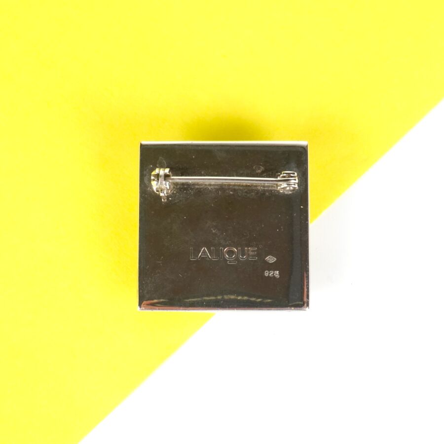 LALIQUE : Broche en argent (925/oo), plateau de forme carré retenant une plaque en cristal incolore moulé-pressé figurant un visage de femme encadré de quatre dauphins, présentée dans sa housse d'origine non logotée, Dim. 3.1 x 3.1 cm. Poids brut : 23.5 g environ.