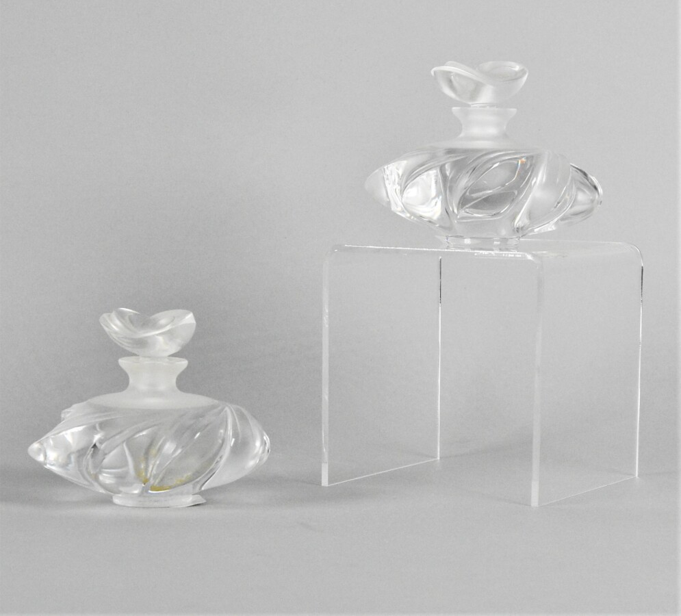 LALIQUE France : Ensemble de 2 flacons de parfum en verre pressé moulé, signé à la pointe au-dessous, H. 7.5 cm.