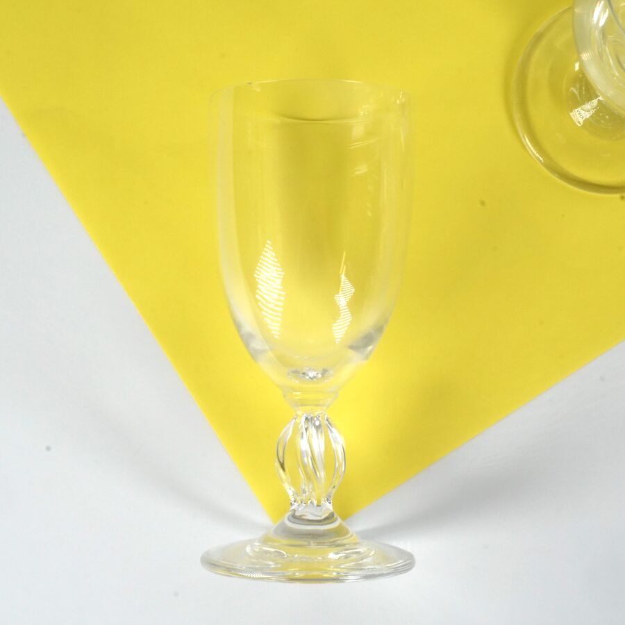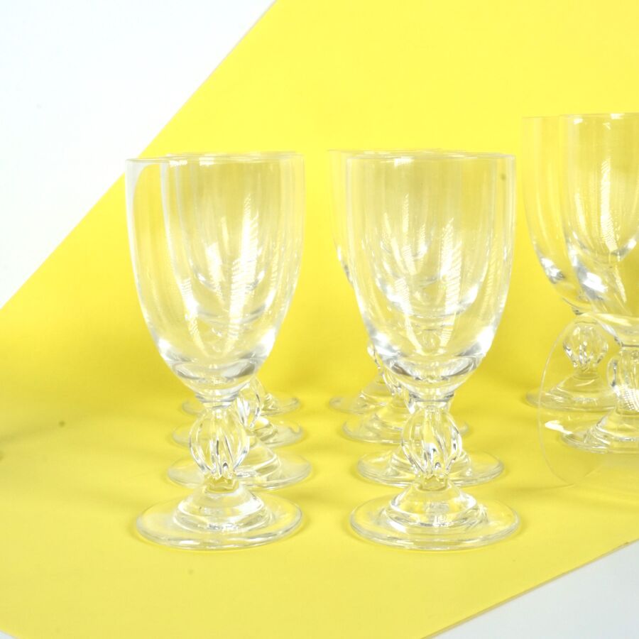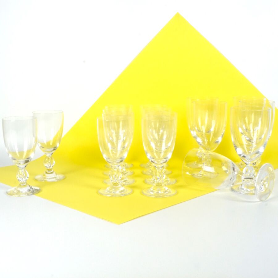 LALIQUE FRANCE : Partie de service de verres, modèle "Fréjus", en cristal, comprenant 6 verres à vin et 10 verres à porto, signés, H. 12.5 cm. H. 14 cm (égrenures).