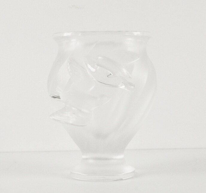 LALIQUE France : Petit vase sur piédouche de forme balustre en verre pressé moulé, la panse à côtes torses ornée de 2 moineaux aux ailes déployées en relief, signé dessous, H. 13 cm.