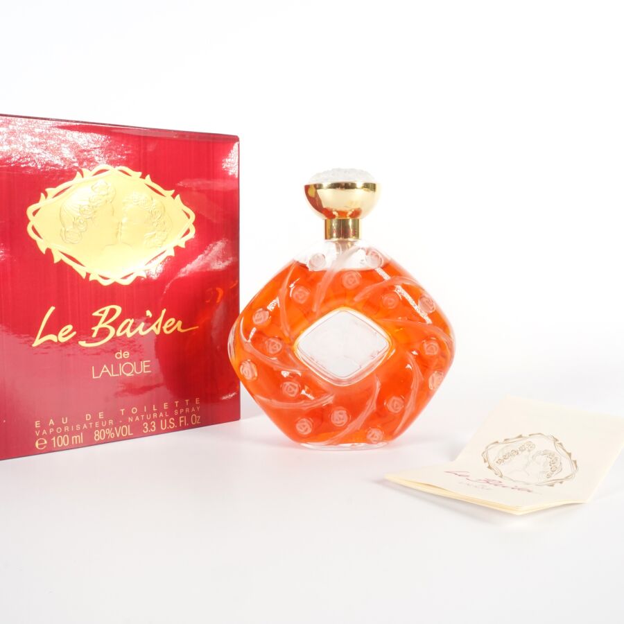 LALIQUE : "Le baiser", flacon de parfum en cristal incolore moulé pressé à motif satiné dans le centre d'un couple s'embrassant dans un entourage de roses, le bouchon à motif de roses satiné, bouchon vaporisateur, présenté dans sa boîte d'origine, avec sa notice (100 ml).