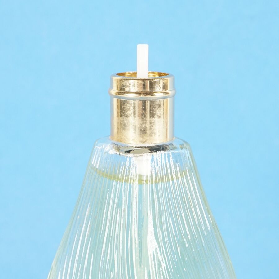 LALIQUE : "Nilang" (2011), flacon factice en verre incolore pressé-moulé, à motif d'un vase rainuré, le bouchon figurant un bouton de rose en verre teinté vert clair, titré, H. 20 cm (liquide factice, sans bouchon vaporisateur).
