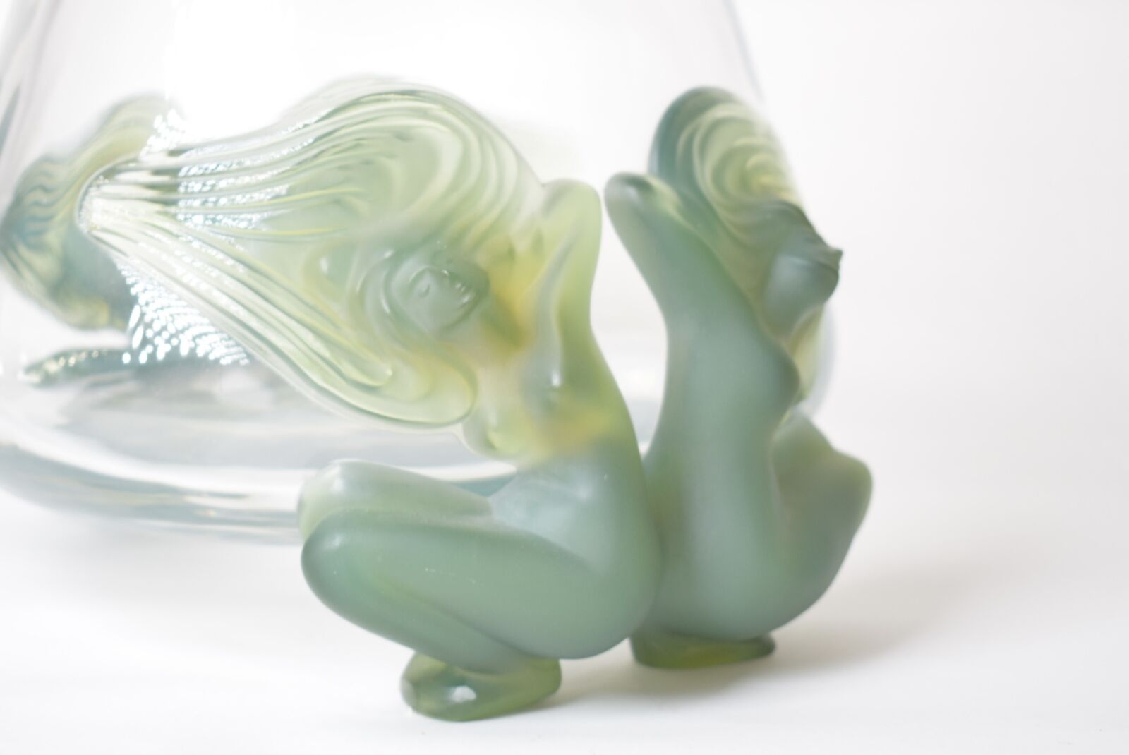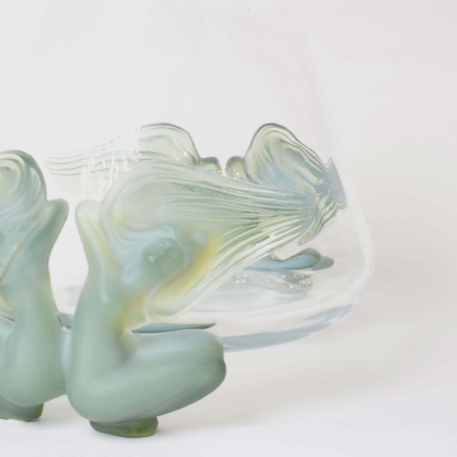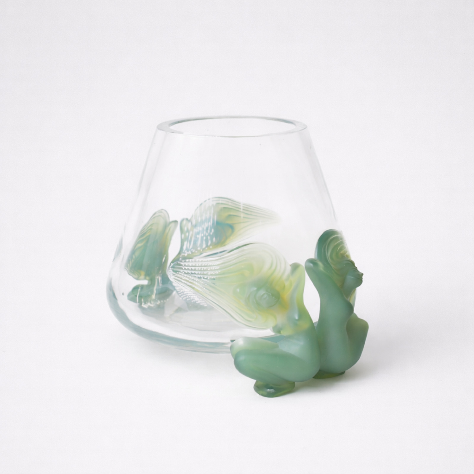 LALIQUE : Vase conique en cristal moulé et verre opalescent, modèle « Antinéa », orné de sirènes formant piétements, signé, H. 21 cm, Diam. 12.5 cm.