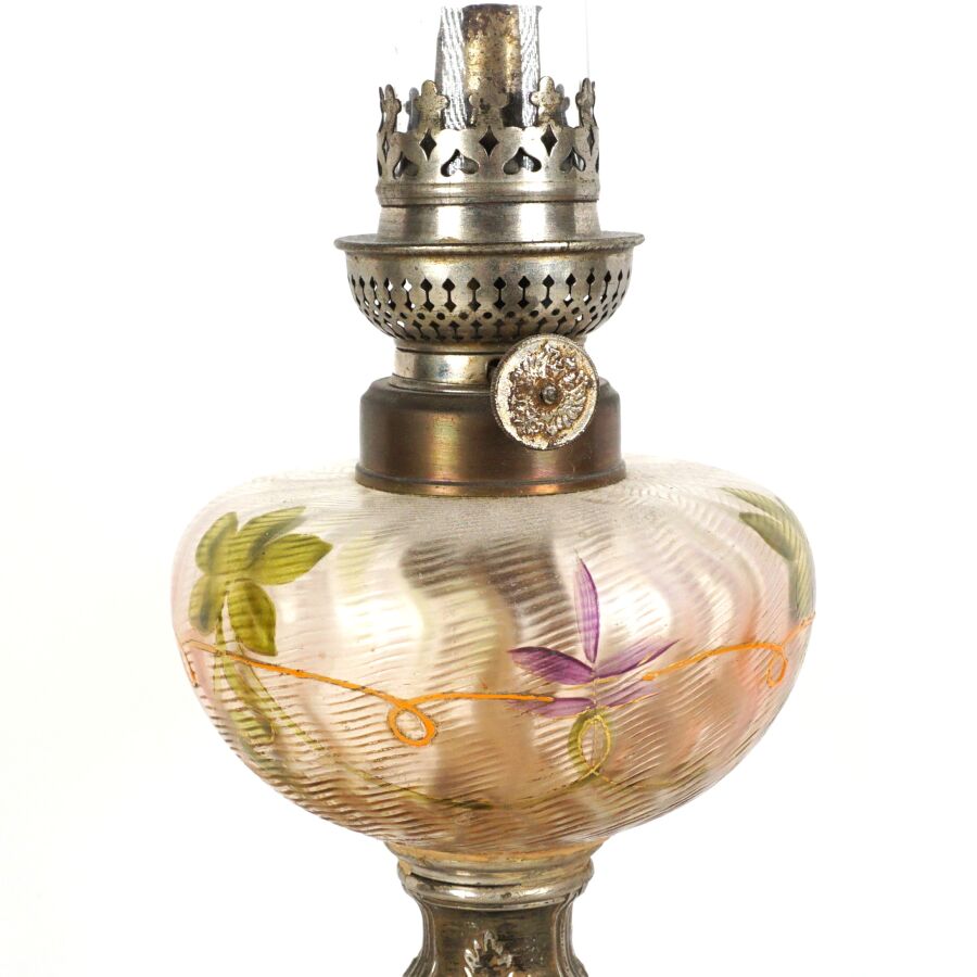 Lampe à huile, le fut en bronze à décor de fleurs, le réservoir en verre peint figurant des végétaux, de style Art Nouveau, H. 38 cm.