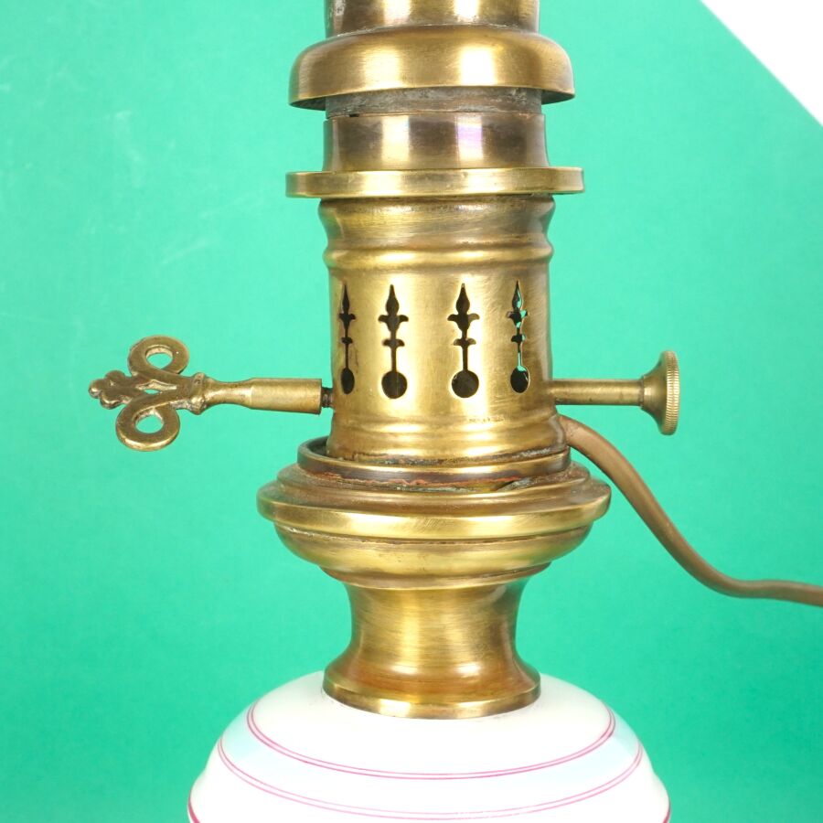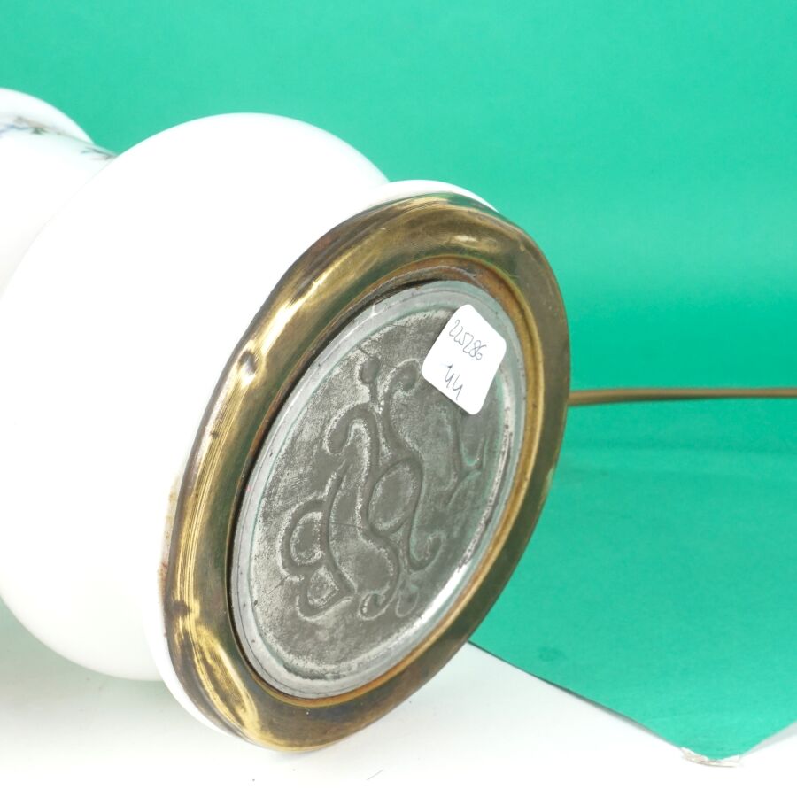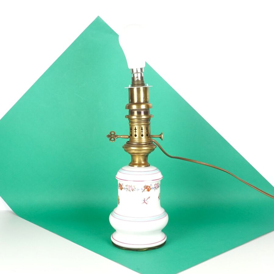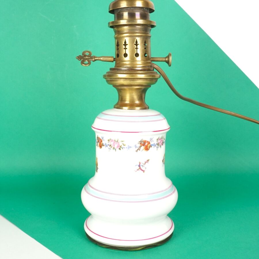 Lampe à pétrole, corps en porcelaine émaillée polychrome à décor de guirlandes de fleurs, H. 43 cm (électrifiée).