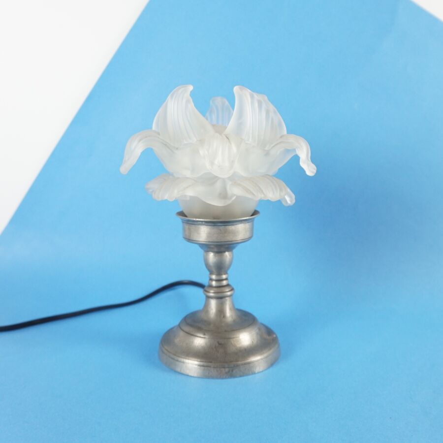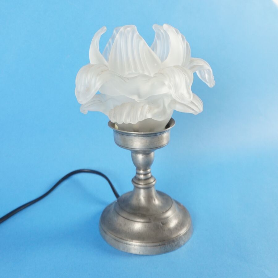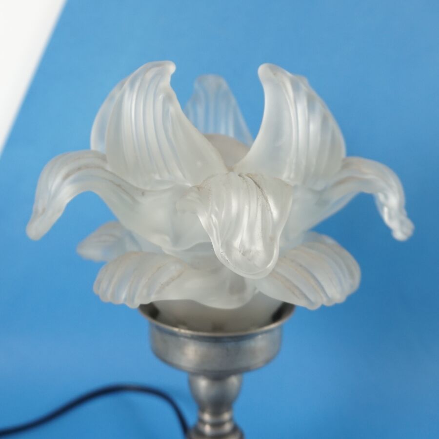 Lampe à poser, fleur en verre dépoli, fût tourné en étain, travail de style Art Déco, H. 22 cm