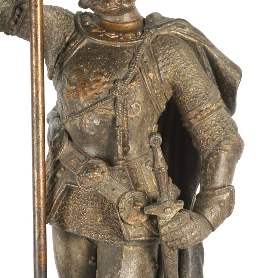 Lampe torchère en régule figurant un chevalier en armure tenant une torche, la tulipe en verre sablé moulé à motif d'une flamme, travail de la fin du 19ème - 20ème siècle, H. 86 cm (petites usures à la patine).