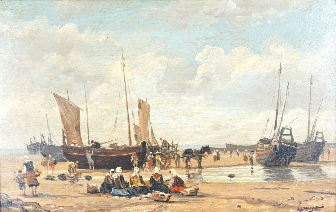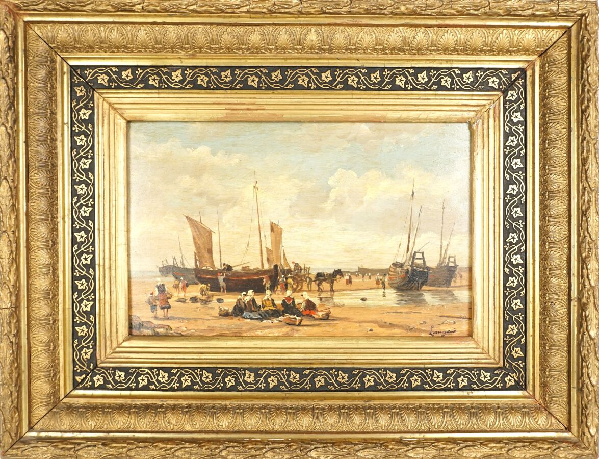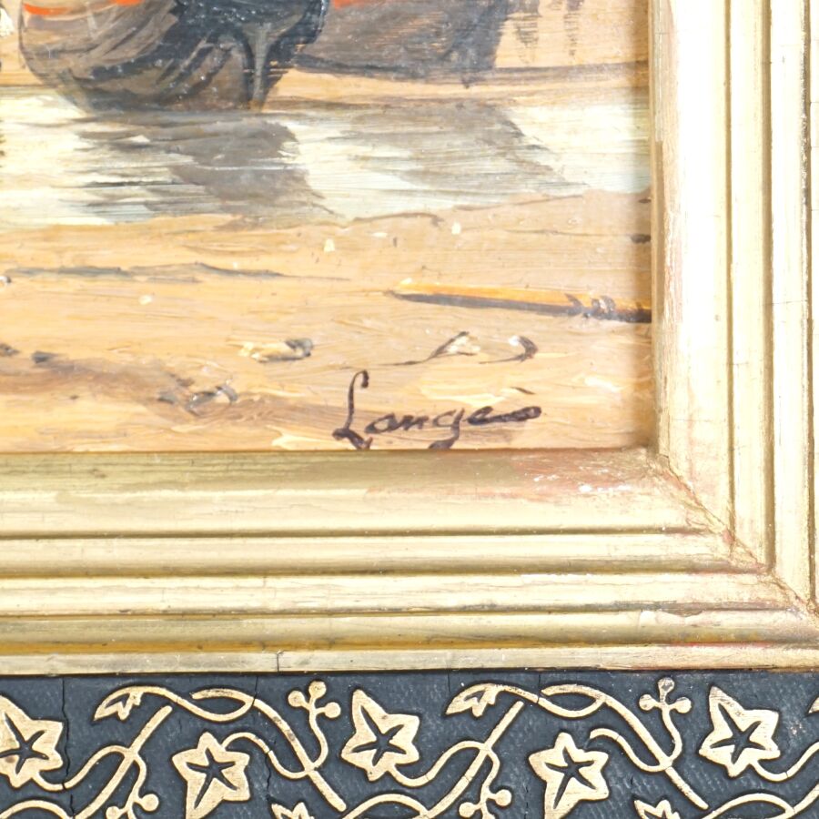 LANGES (XXe), "Retour de pêche", huile sur panneau, signée en bas à droite, 18,5 x 28 cm.