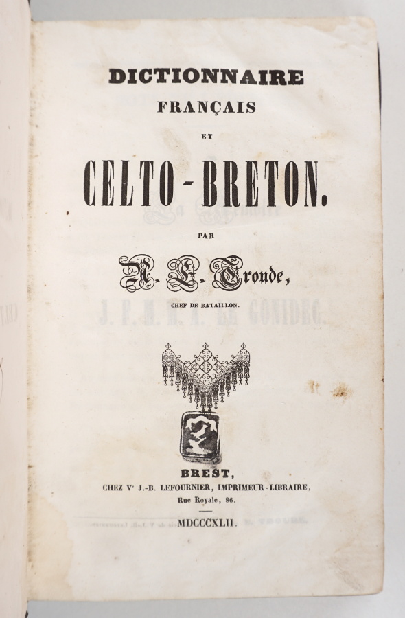 [LANGUE BRETONNE] - TROUDE (A. E.) - Dictionnaire français et celto-breton - Brest ; Veuve J.-B. Lefournier, 1842 - 1 volume In-8° - LXV, 592, [2] pages - Texte sur 2 colonnes - Reliure de l'époque demi-chagrin brun à coins (3 coins usés, 1 coin émoussés, manques de papier aux plats, parties de coupes usées) - Dos lisse orné et titré or - 1ère édition.