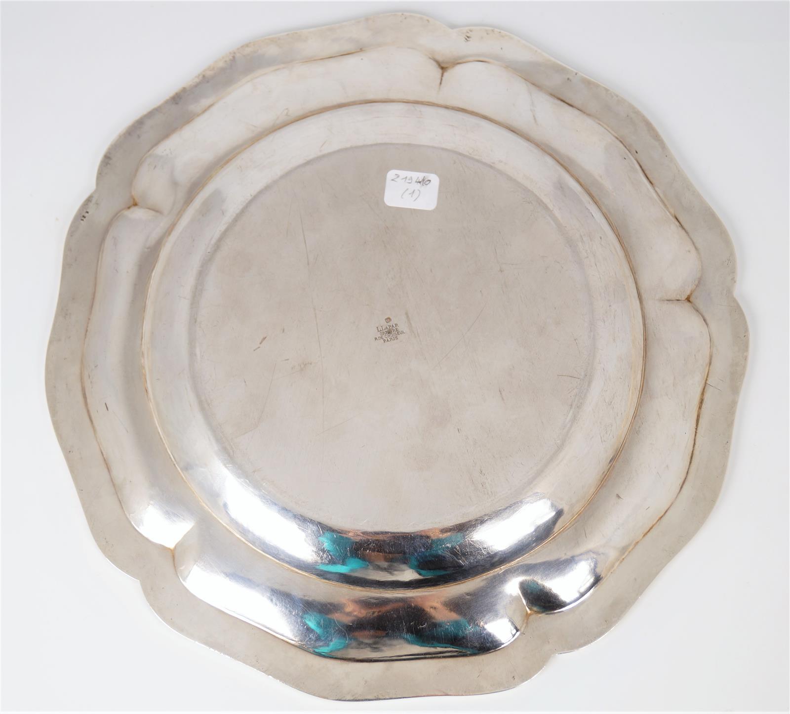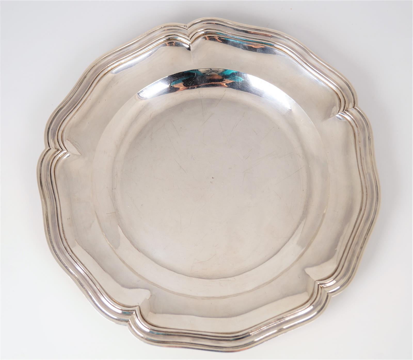 LAPAR Orfèvre à Paris : Plat rond en argent, poinçon Minerve, à bord contourné, modèle filets, D. 30 cm. Poids brut : 840 g environ (quelques petites rayures)