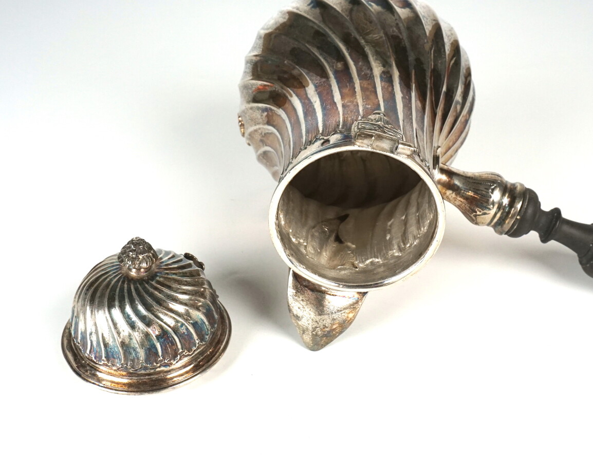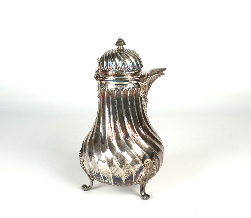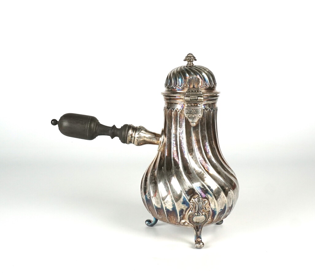 LAPAR : Petite chocolatière tripode en argent, poinçon Minerve 1er titre, à décor de cotes torses, le bec orné de coquilles et feuillages, les pieds formés de cartouches feuillagés, manche en bois tourné noirci, H. 17.5 cm. Poids brut : 330 g environ (le couvercle à refixer).