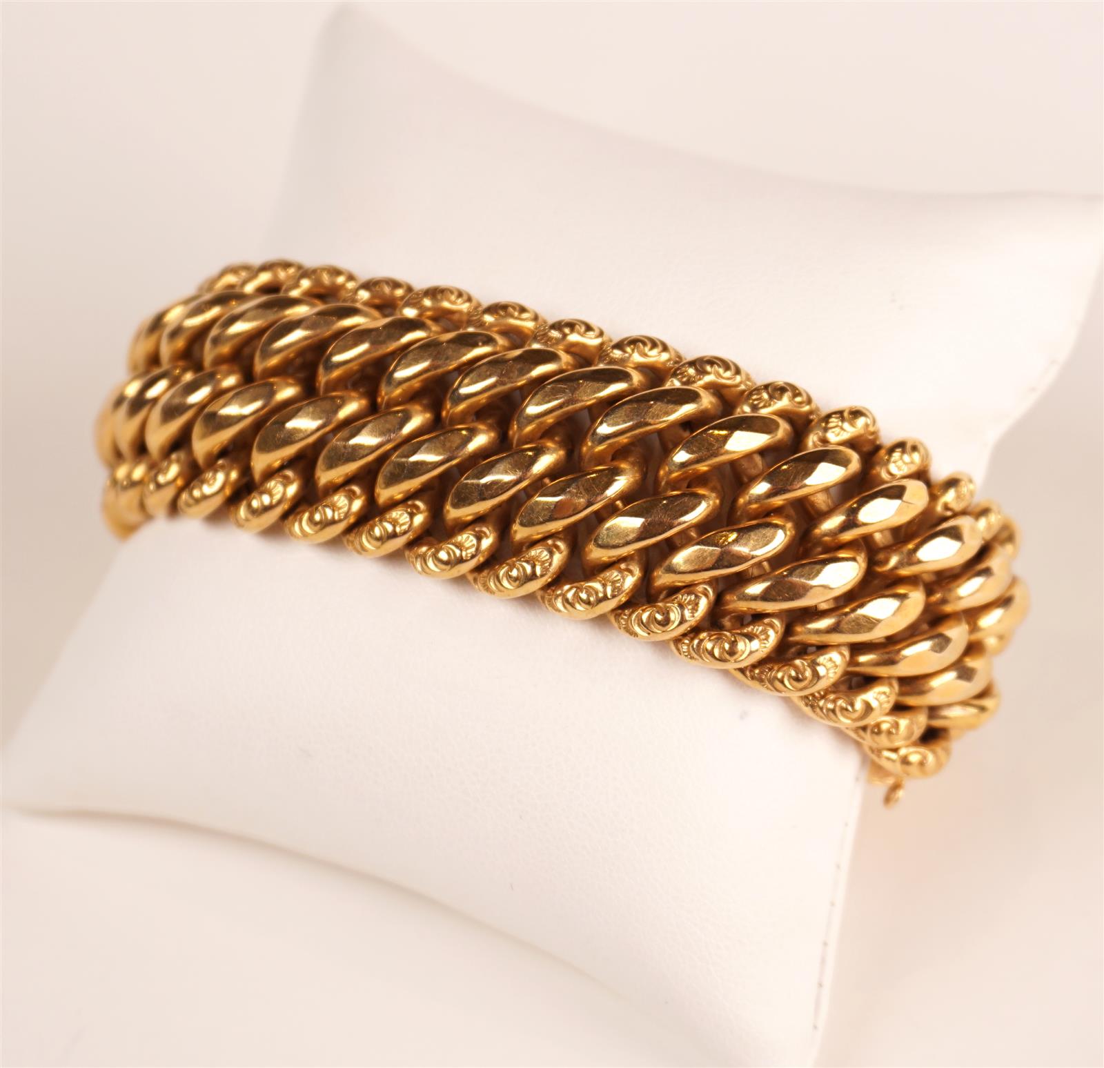 Large bracelet maille américaine en or jaune 18 K (750/oo), L. 19 cm, larg. 2.5 cm. Poids brut : 49.61 g environ.