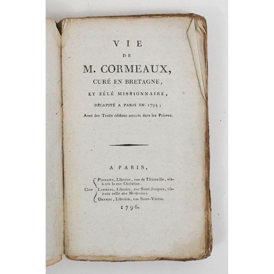 [LASAUSSE (Jean-Baptiste)]. Vie de M. Cormeaux, curé en Bretagne et zélé missionnaire, décapité à Paris en 1794 ; avec des Traits édifiants arrivés dans les prisons. Paris, chez Pichard, Laurens et Onfroy, 1796. In-12, broché, couv. d'attente.