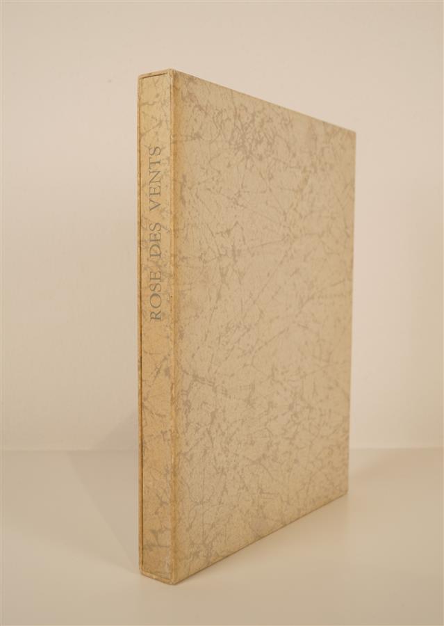 LE DUCHAT D'AUBIGNY (J.) - Rose des vents - Paris ; Sans nom, 1961 - 1 volume grand In-4° en feuillets sous couverture rempliée titrée et ornée d'1 vignette au 1er plat, sous chemise cartonnée marbrée grise titrée au dos et emboîtage à l'identique - Fac-similé d'1 lettre de Jean Cocteau à l'auteur en frontispice, gravures sur bois in et hors-texte en bleu de François d'Aquin - Très bel exemplaire numéroté sur vélin de Rives teinté (14 sur les 200, tirage total : 201).