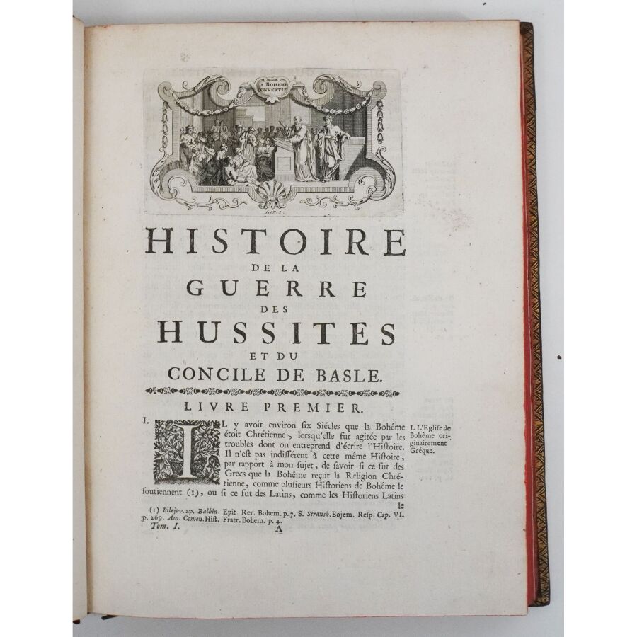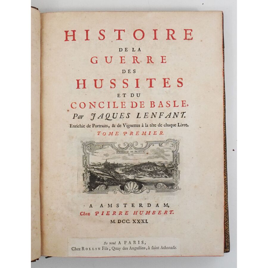 LENFANT (Jacques). Histoire de la guerre des Hussites et du Concile de Basle. Amsterdam, Pierre Humbert, 1731. 2 volumes in-4 basane brune, dos à nerfs ornés, pièces de titre et de tomaison en maroquin brun, tranches rouges (reliure de l'époque). [2]-XVII-[1]-484 pp. ; 387 pp.