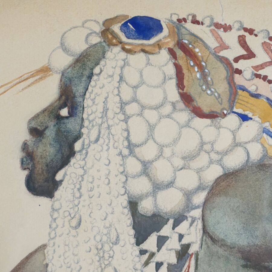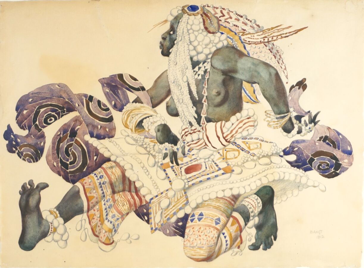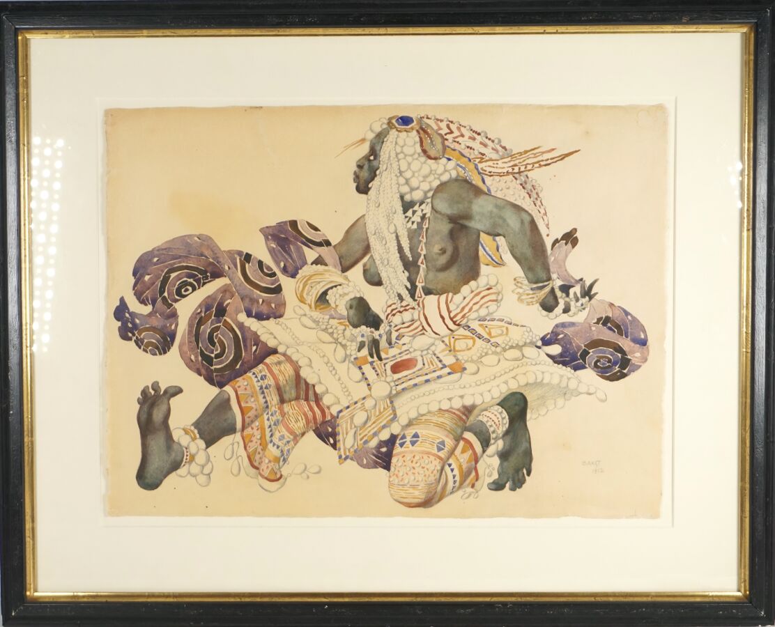 Leon BAKST (1866-1924), "Projet de costume pour la Danseuse du Temple, ballet Le Dieu Bleu", 1912, aquarelle, gouache, crayon sur papier velin teinté, signée et datée en bas à droite "BAKST 1912", 45 x 60 cm (déchirures en haut à gauche et au centre bas).