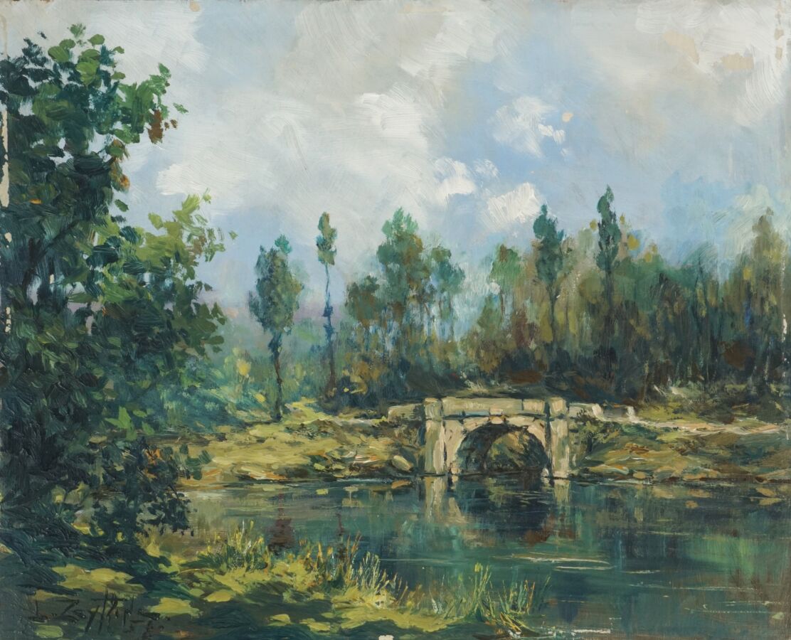 Léon ZEYTLINE (1885-1962), "Le Vieux Pont de pierre", huile sur panneau, signée en bas à gauche, circa 1950, 22 x 27 cm.