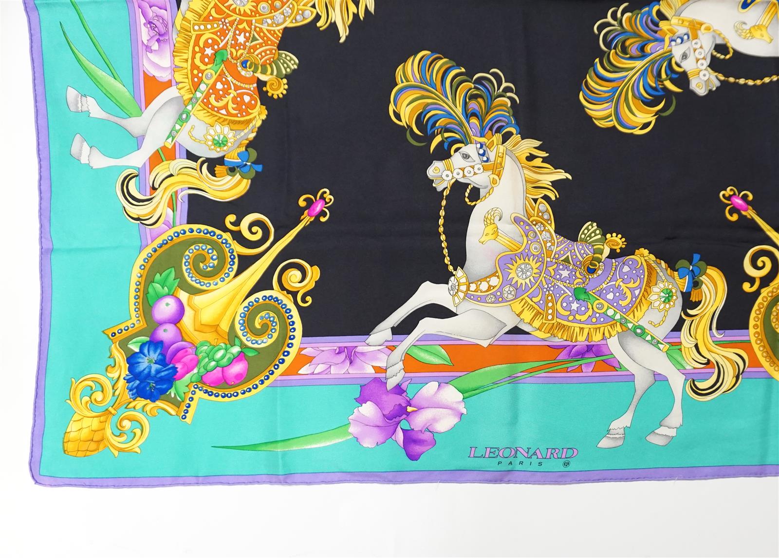 LEONARD Paris : Carré de soie imprimé à décor de chevaux caparaçonnés, marge turquoise, fond noir, 88 x 88 cm.